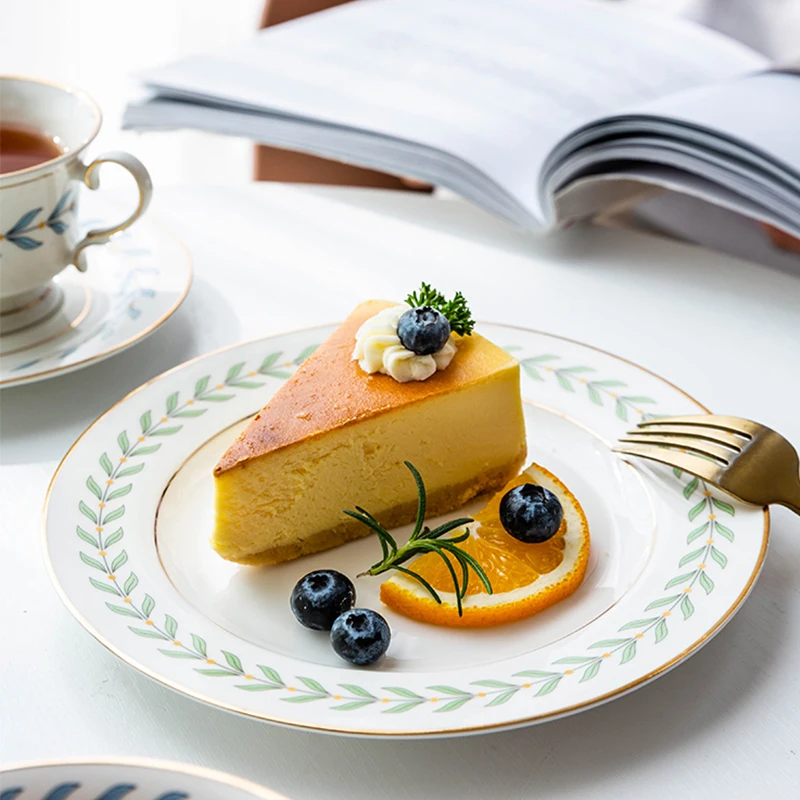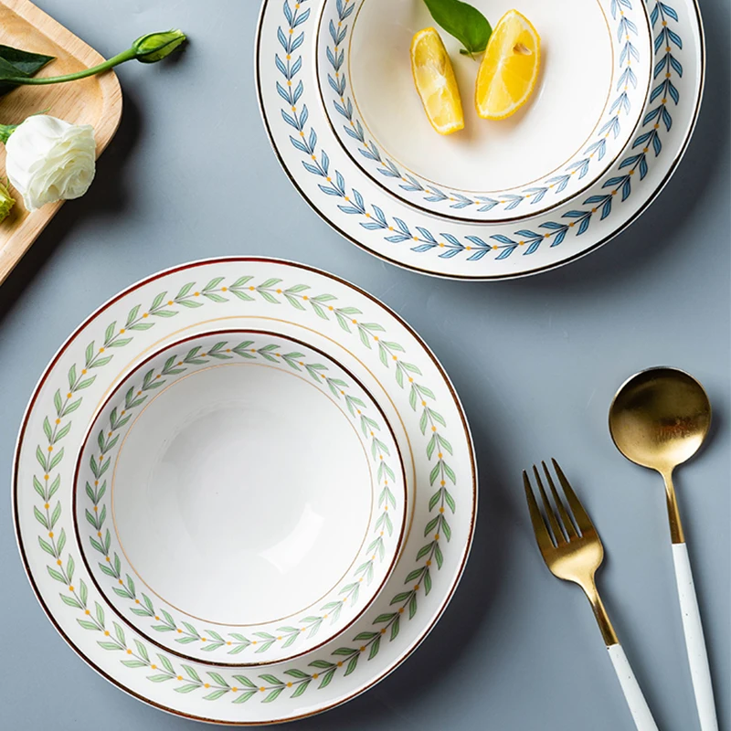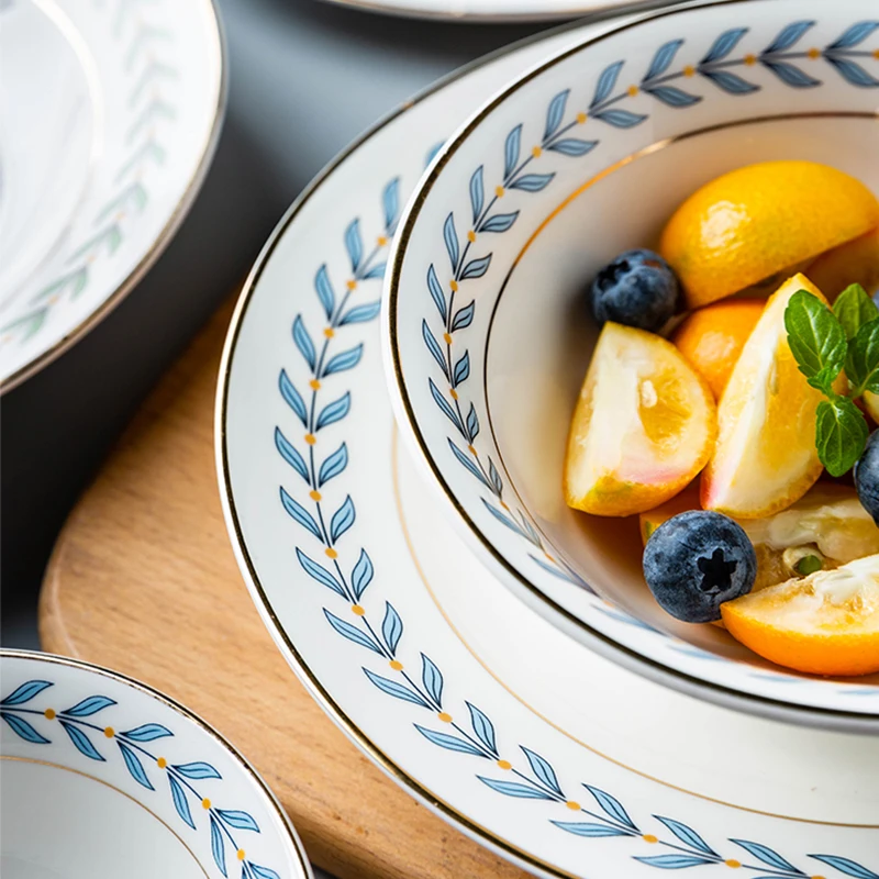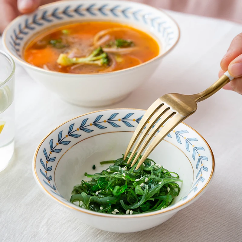 KINGLANG Nuovo piatto da pranzo in ceramica dorata con bordo a foglia Piatto da dessert per insalata di riso in porcellana all’ingrosso