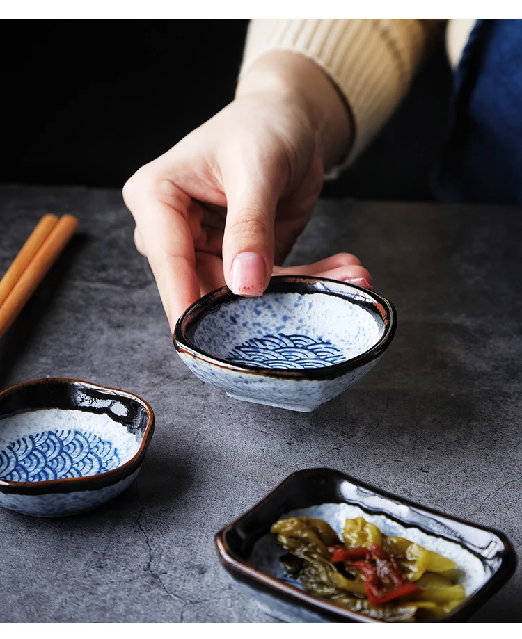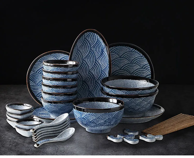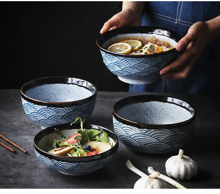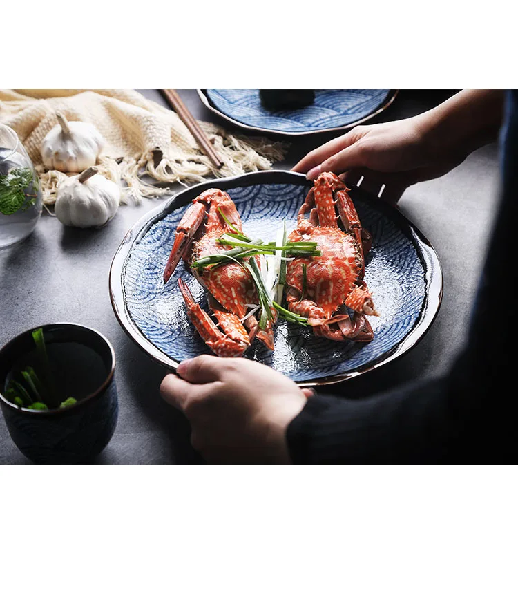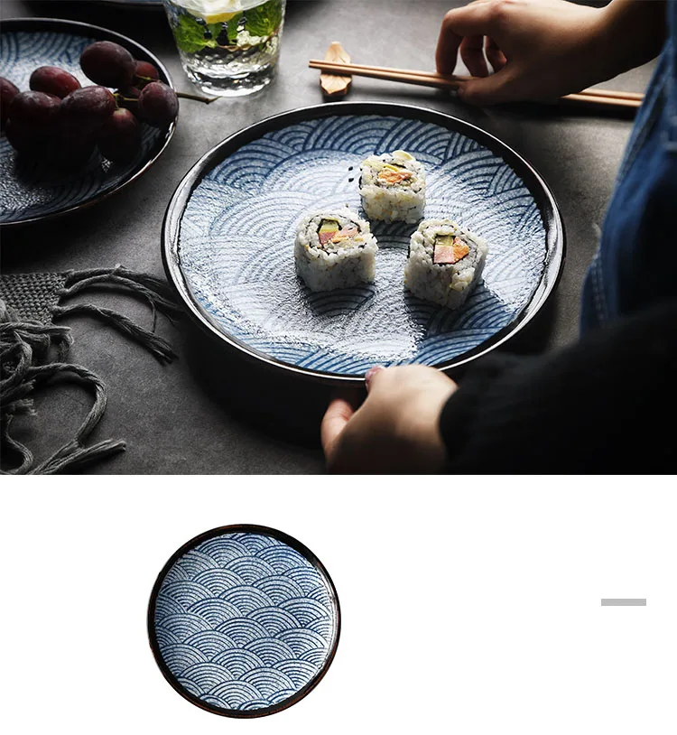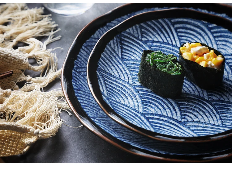 Kinglang Tradizionale Giapponese Mare Ripple Design di Colore Blu Unico di Ceramica da Tavola Sushi Rotondo Piatto di Riso Grande Ciotola di Noodle