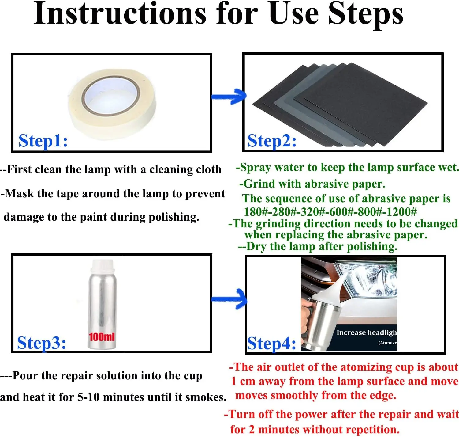 1.Non conservare il prodotto al sole.Si prega di indossare una maschera durante l’operazione.Le donne incinte, i bambini e gli anziani non sono consentite a contattare!La chiave per la riparazione dei fari è lucidatura.