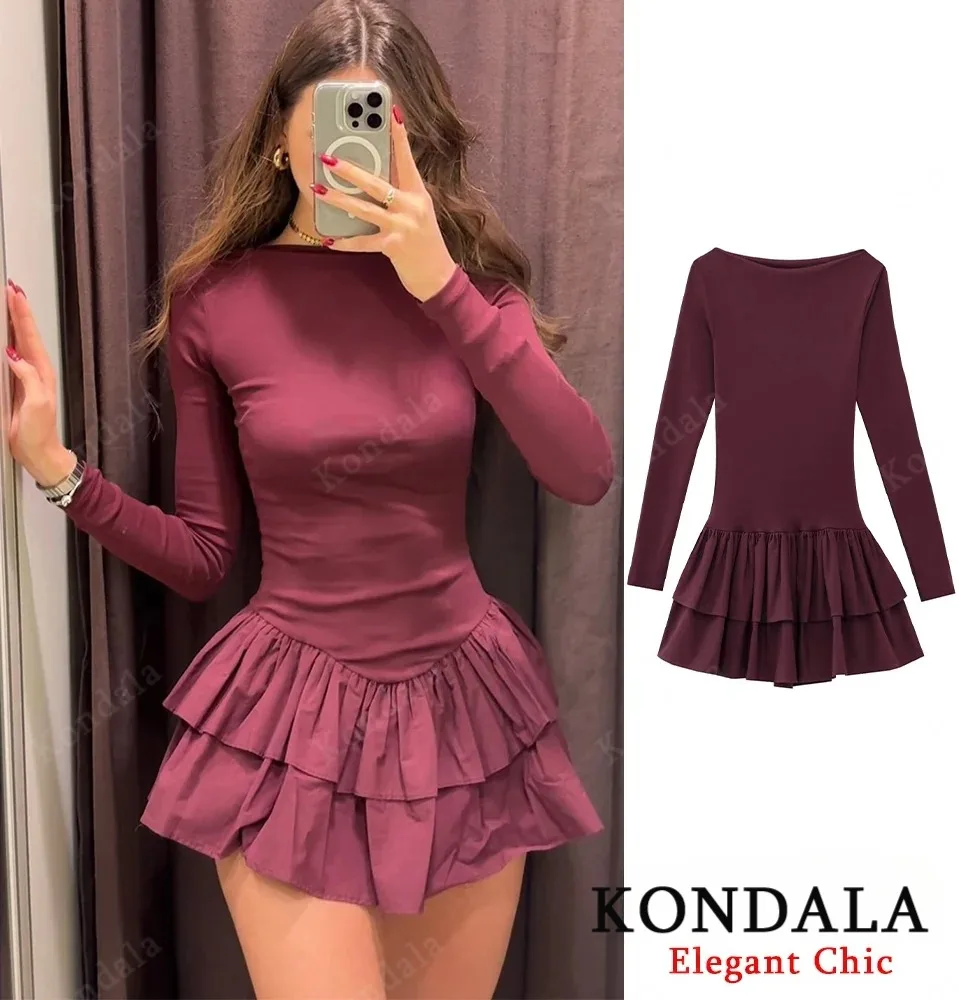 KONDALA Donna Autunno Elegante Abito a maniche lunghe Orlo a strati Stretch Slim Marrone Abito corto 2025 Abito retrò casual moda primaverile