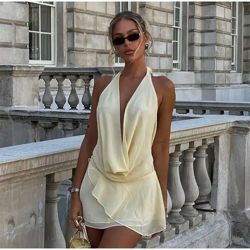 KWTX Elegante pizzo in raso Mini abito chic manica svasata pieghettato abito senza schienale nuova estate femminile cena festa spiaggia Vestido 2025