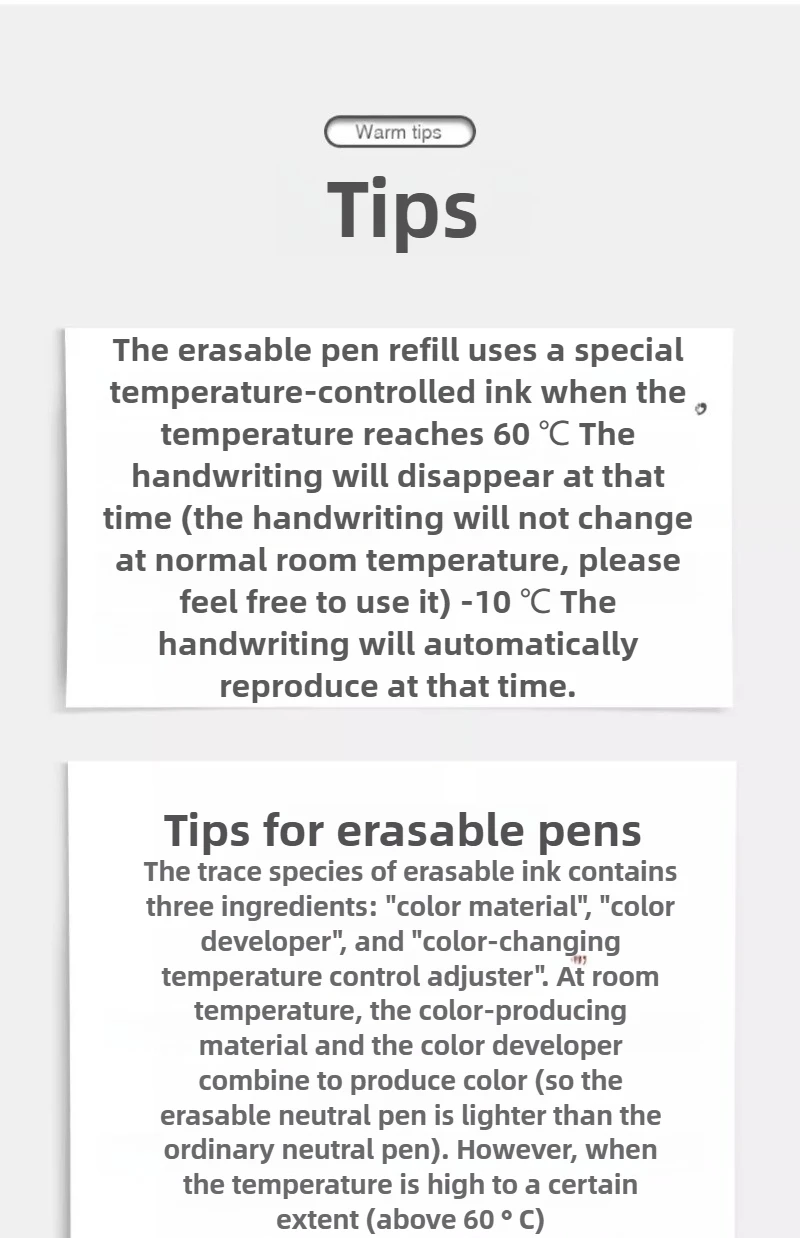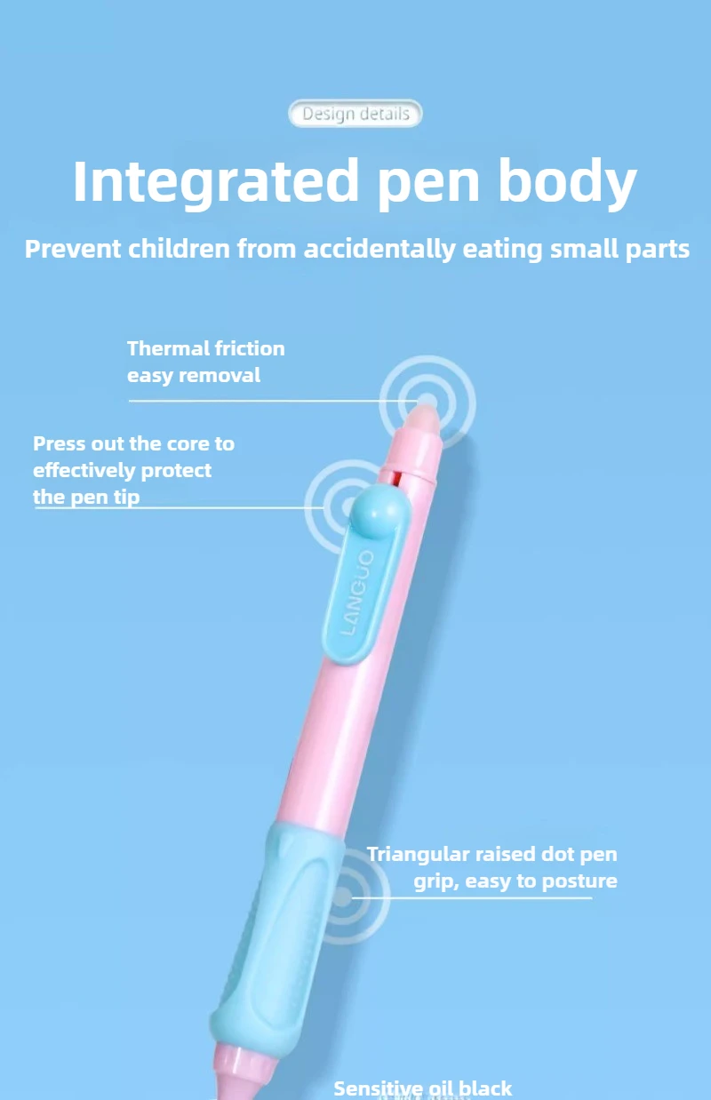 Questa penna presenta un esclusivo design integrato del corpo della penna, non solo semplice ed elegante nell’aspetto, ma impedisce anche ai bambini di ingerire accidentalmente piccole parti, rendendola sicura e ponderata.La tecnologia di attrito termico consente una facile rimozione della scrittura errata, eliminando la necessità di preoccuparsi che il fluido correttore o il nastro rovinino la pulizia della scrittura.Il design della ricarica a pressione per estendere protegge efficacemente la punta della penna, prolungandone la durata e garantendo che la scrittura rimanga fluida e duratura.
