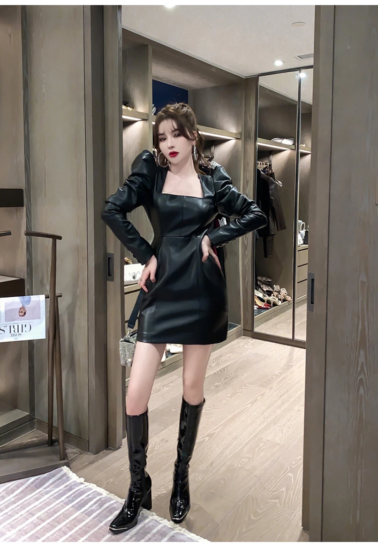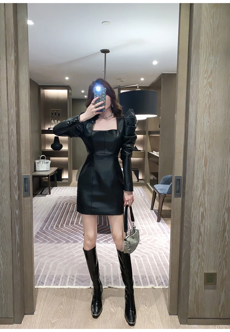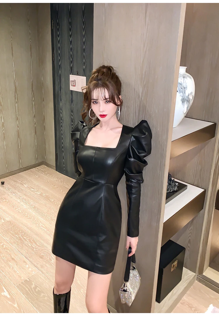Lautaro primavera autunno Retro nero morbido Mini abito in ecopelle donna con maniche a sbuffo collo quadrato guaina vestiti per le donne 2023
