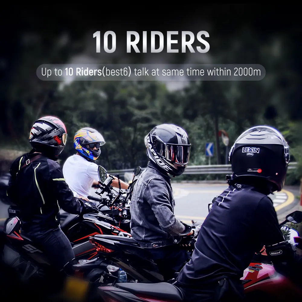 Support up to 6-10 Bikers to talk at one time at a 2000m intercom range(Between the 1st to 10th at an Ideal Enviroument), At a real enviroument, the distance between each 2 riders should be 300-800 meters