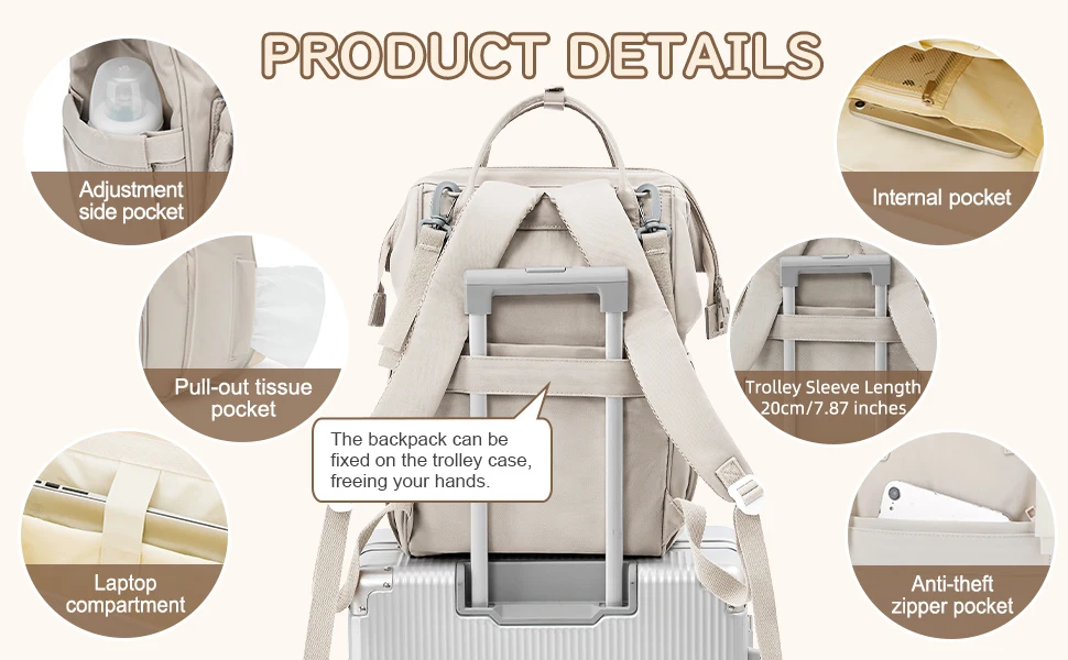 • Multifunzionale :Questo zaino non è solo una borsa per pannolini, ma anche un elegante accessorio da viaggio che può essere utilizzato per altri scopi.