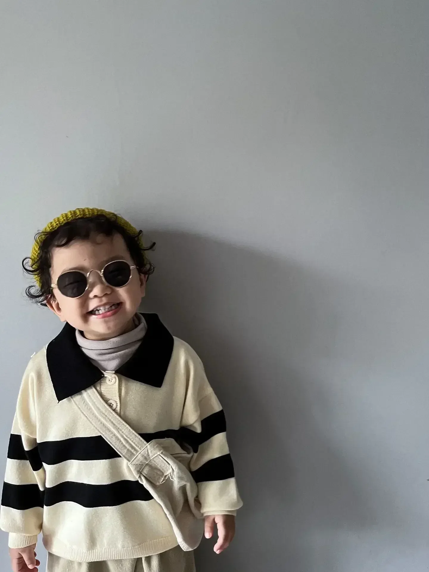 Liquidazione nero 110cm 3494C maglione per bambini Pullover lavorato a maglia maglioni da ragazzo con risvolto a righe a due bottoni maglione tutto abbinato