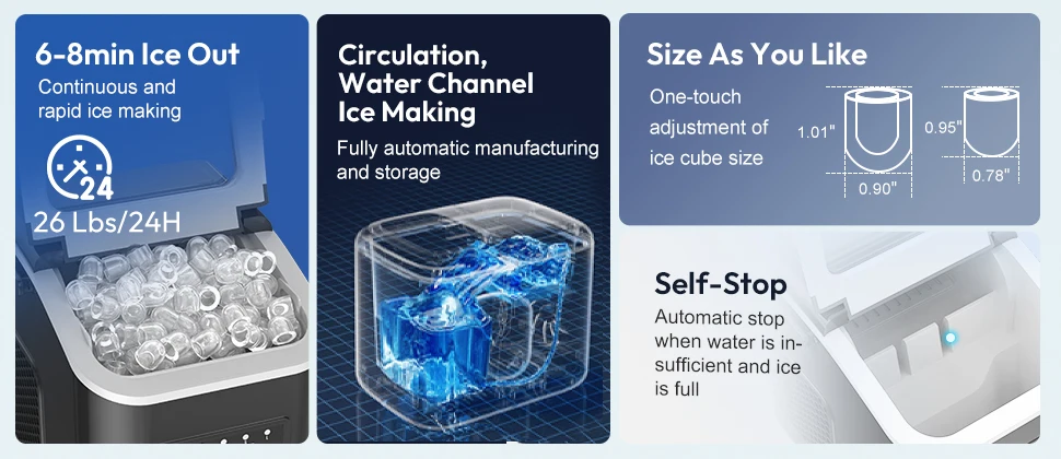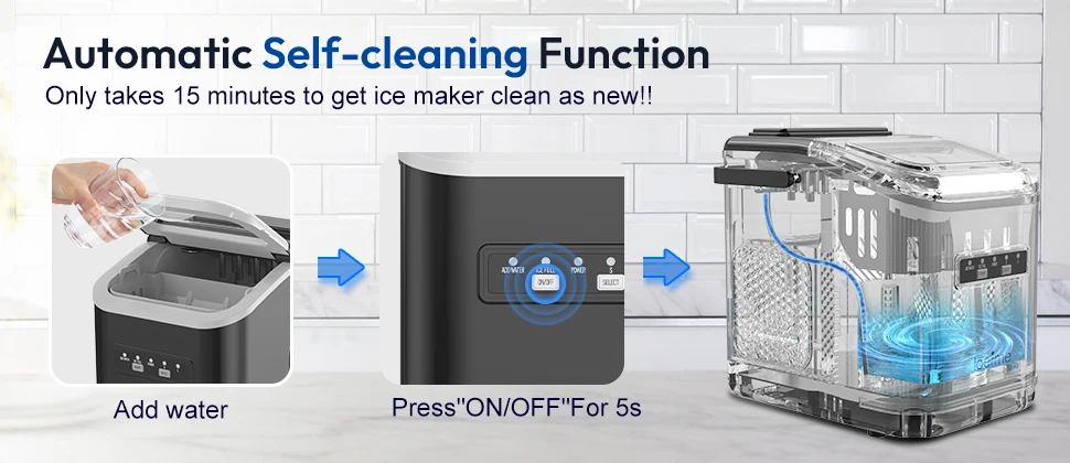 –Funzione autopulente intelligente: avvia il programma di autopulizia di 5 secondi con un clic, senza smontaggio e lavaggio manuali.È comodo da usare attraverso il pannello di controllo superiore, combinato con promemoria intelligenti di carenza d’acqua/ghiaccio pieno, migliora la sicurezza dell’utilizzo ed l’efficienza di manutenzione.