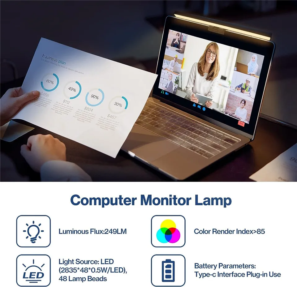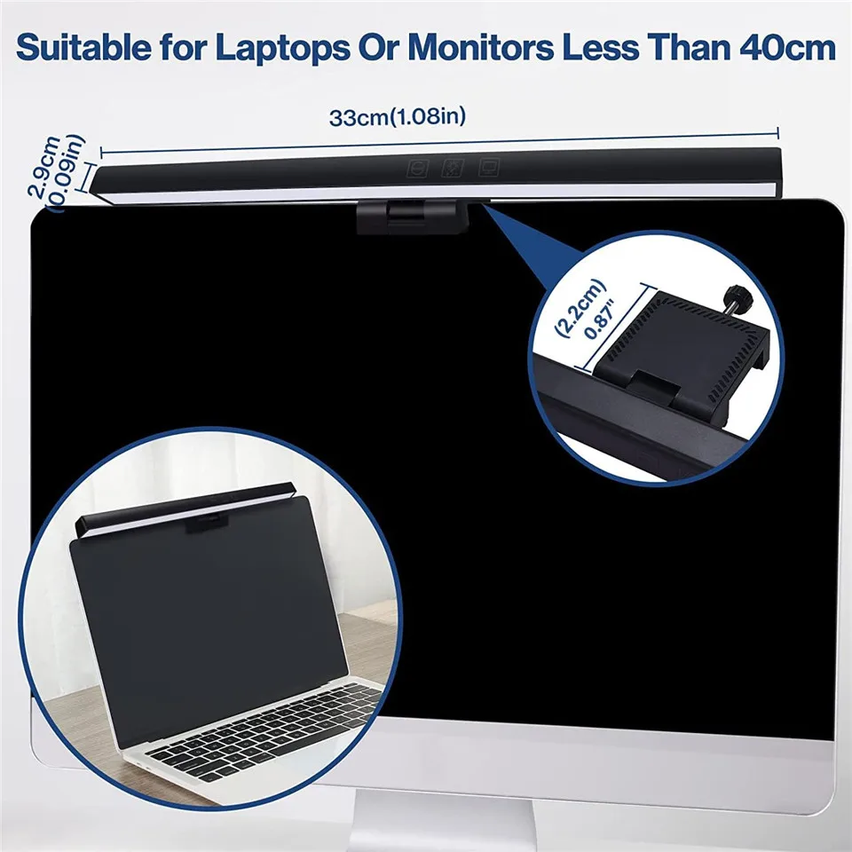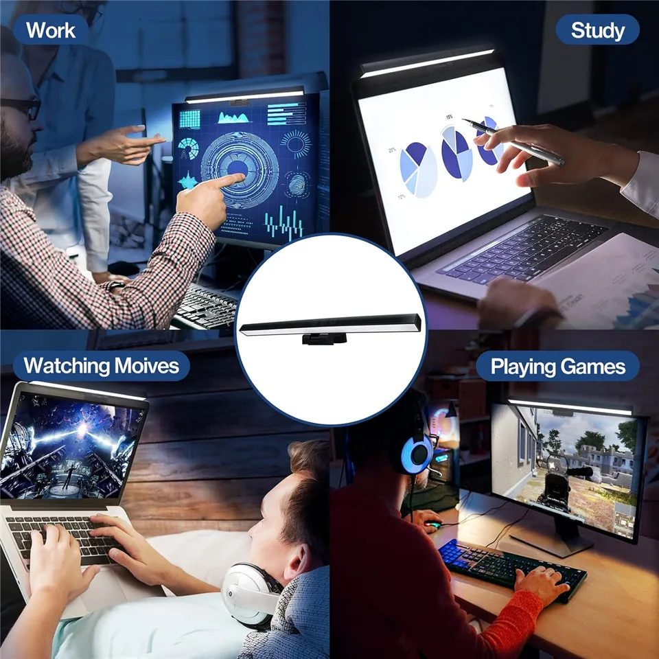 4.Risparmia spazio desktop.Il design salvaspazio rende la luce del monitor del computer costante situata sulla parte superiore del display, risparmia spazio valioso sulla scrivania, molto adatta per spazio di lavoro limitato in ufficio o in casa.