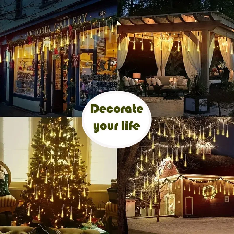 Luce solare per pioggia di meteoriti, albero di Natale, luci a goccia di pioggia che cadono all'aperto per la decorazione della grondaia del giardino della festa nuziale di strada 1Luce solare per pioggia di meteoriti, albero di Natale, luci a goccia di pioggia che cadono all’aperto per la decorazione della grondaia del giardino della festa nuziale di strada