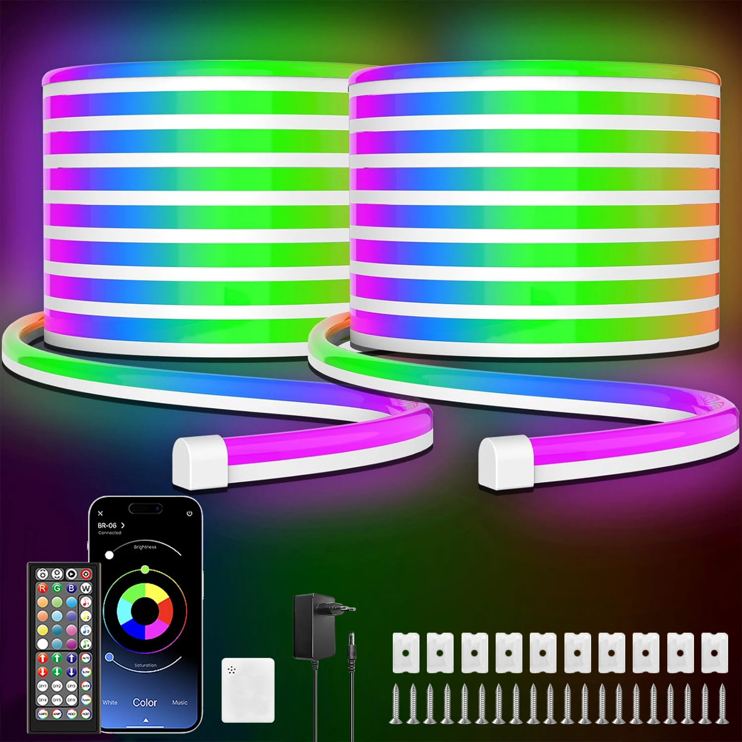 Coppia la striscia led al neon tramite Bluetooth e puoi utilizzare l’app per controllare il colore, la luminosità, la saturazione e la velocità della corda leggera.Con 16 milioni di colori tra cui scegliere e modalità scena individuale, modalità musica e altro.Ci sono molte metodi di controllo, che possono essere controllati da telecomando a infrarossi e APP.