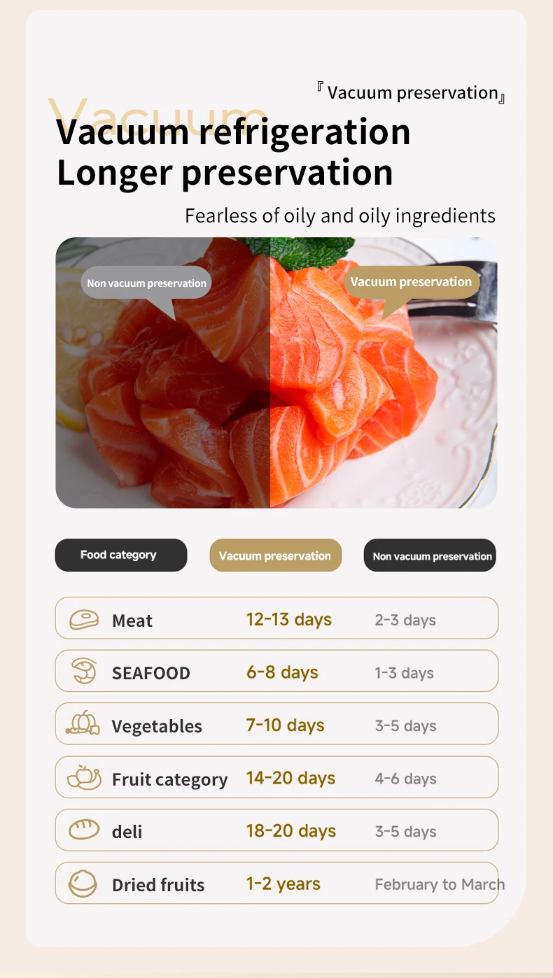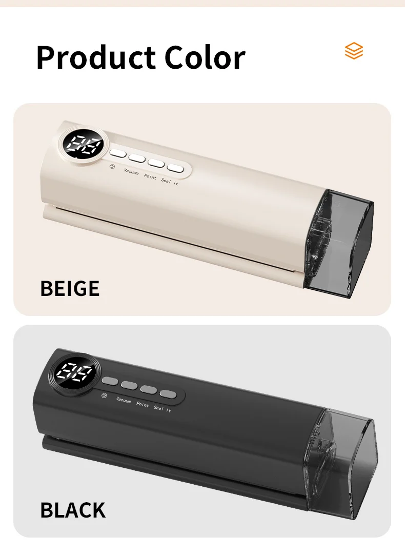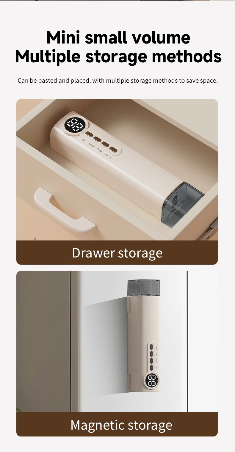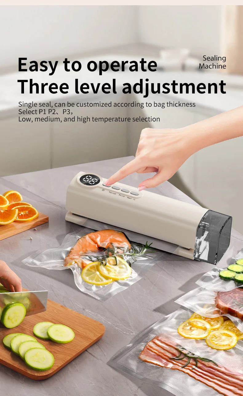 *62kpa strong suction force, three temperature control design according to P1 P2 P3 bag thickness low, medium and high temperature adjusted according to need, visual water storage tank dry/wet sealing to lock fresh food without pressure.