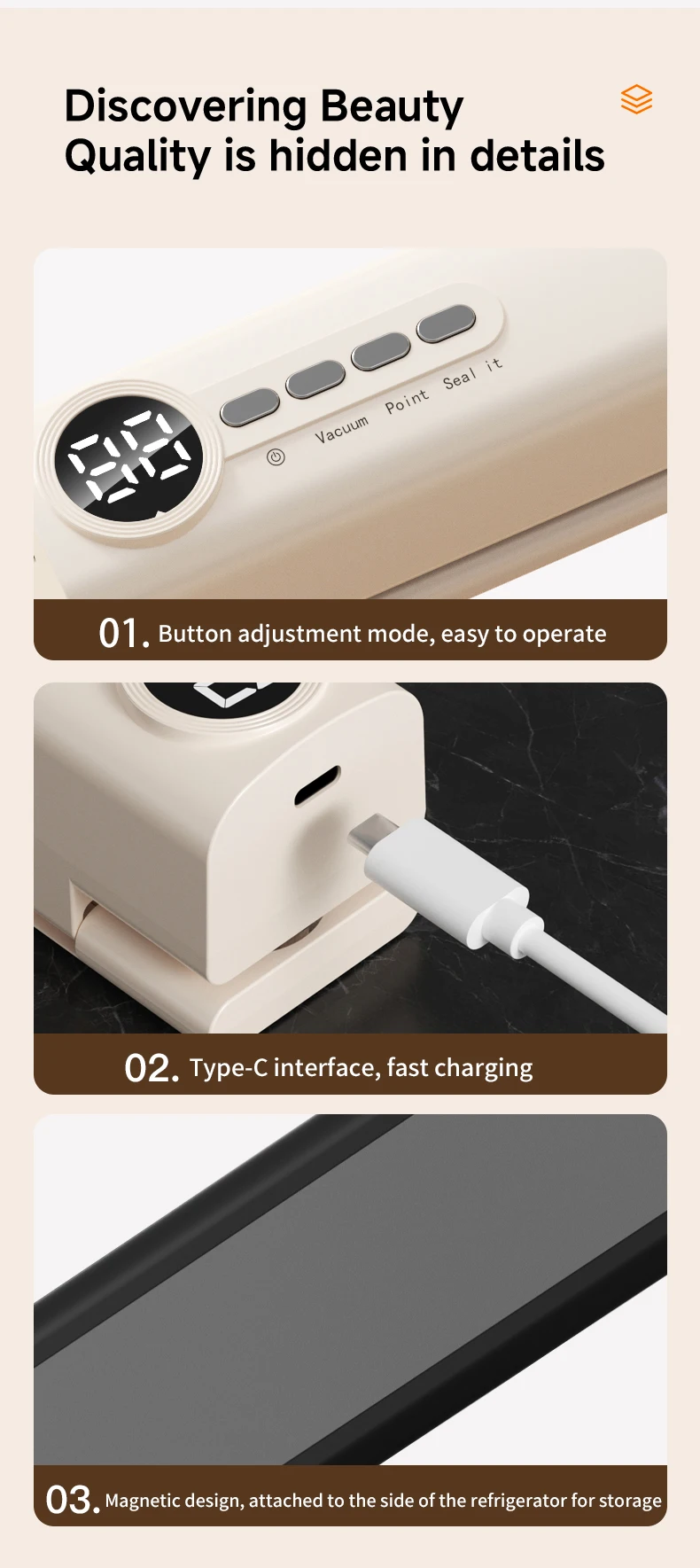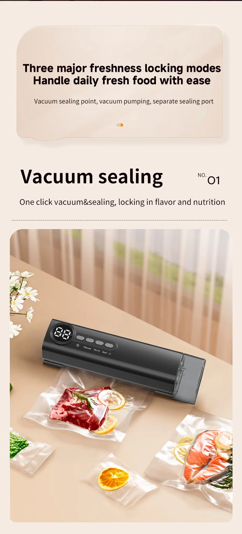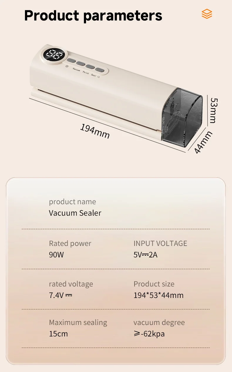 *62kpa strong suction force, three temperature control design according to P1 P2 P3 bag thickness low, medium and high temperature adjusted according to need, visual water storage tank dry/wet sealing to lock fresh food without pressure.