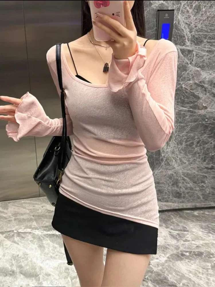 Maglia trasparente irregolare maglietta per le donne nuova manica lunga trasparente pullover coreano top sexy autunno ragazze top maglietta casual
