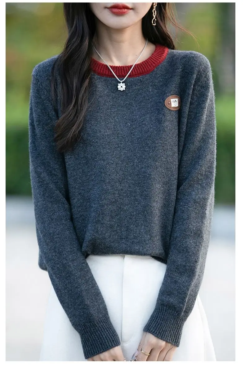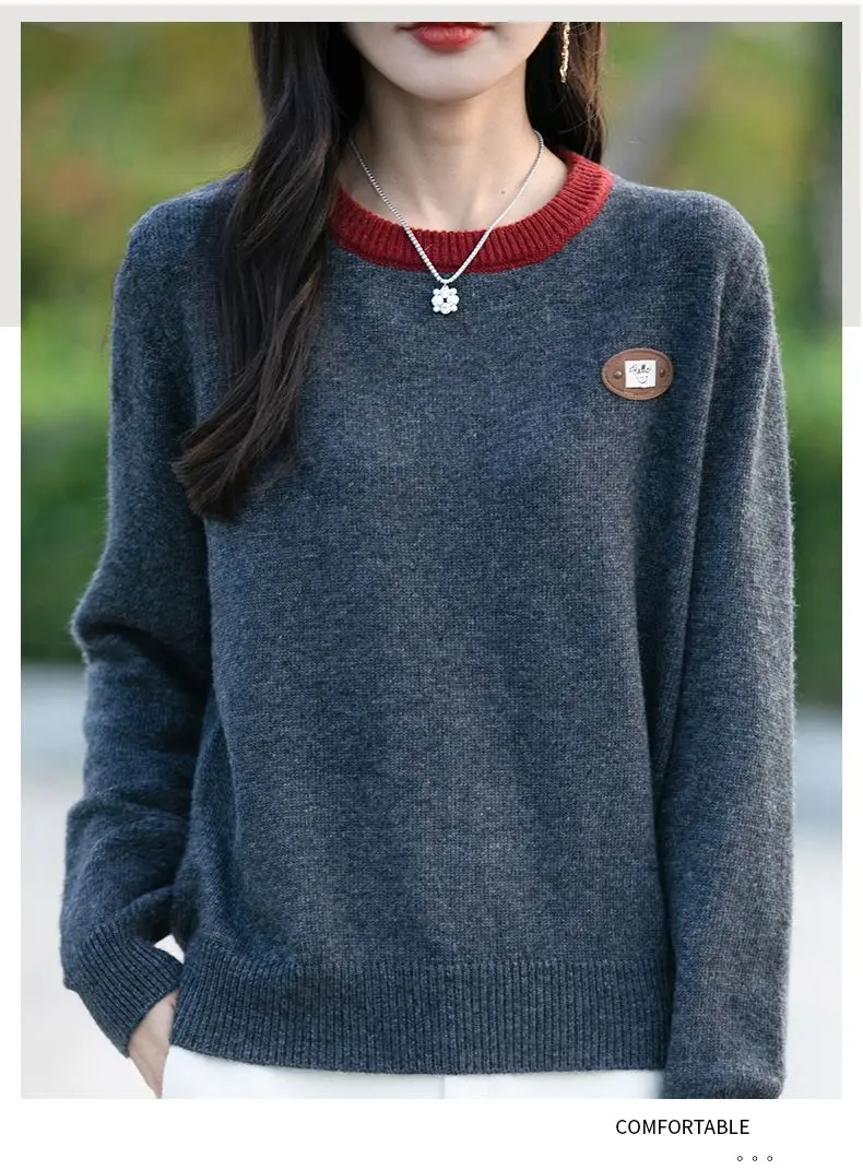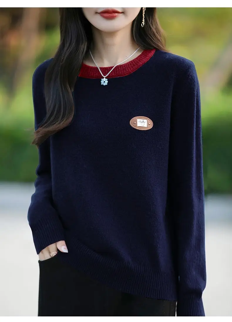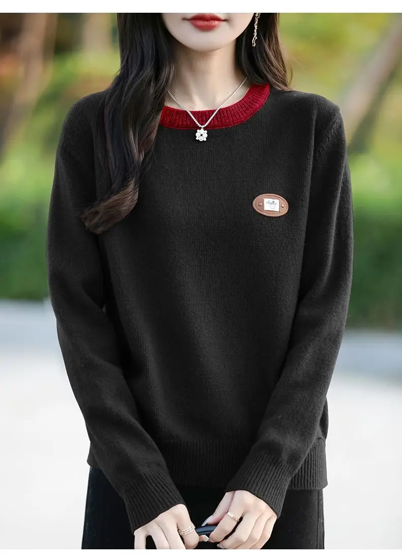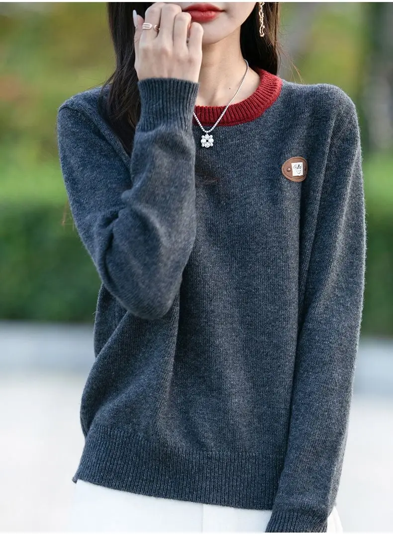 Maglione a maniche lunghe con scollo tondo in colore a contrasto per donna Camicia base esterna e lavorata a maglia alla moda e alla moda