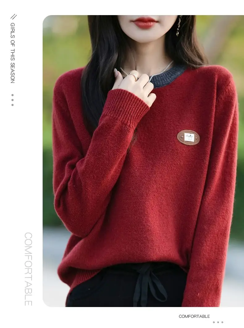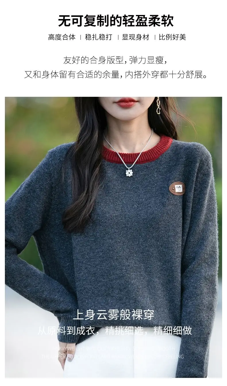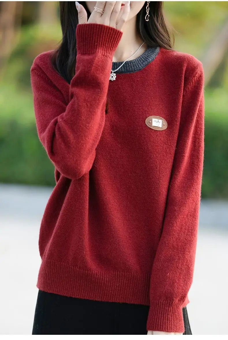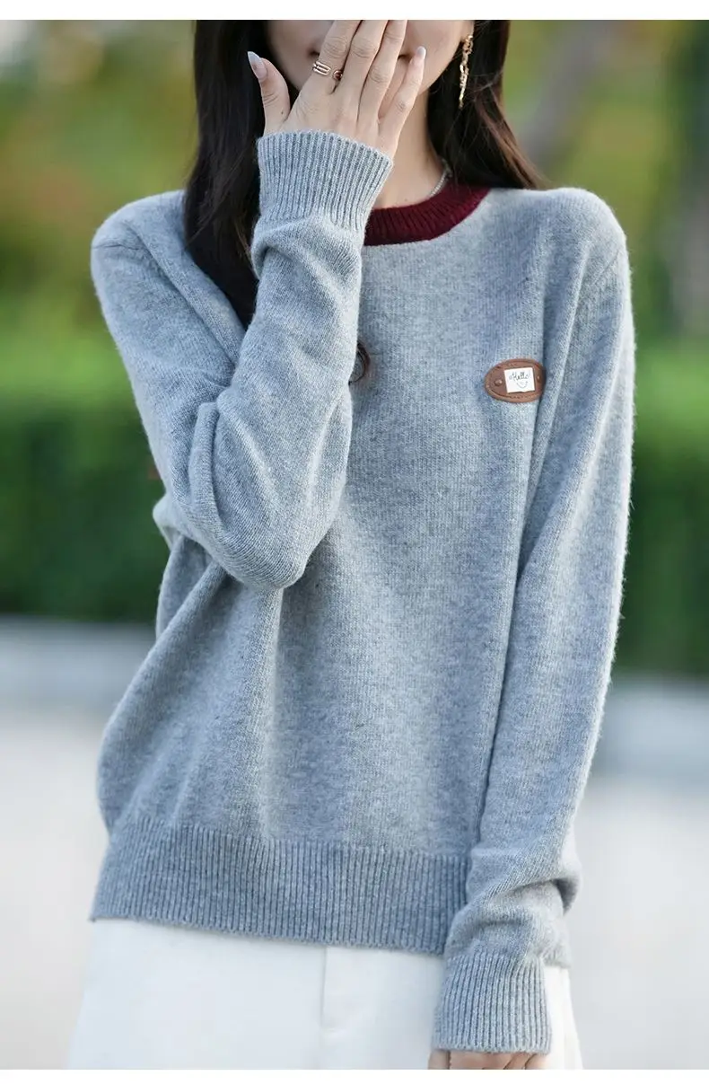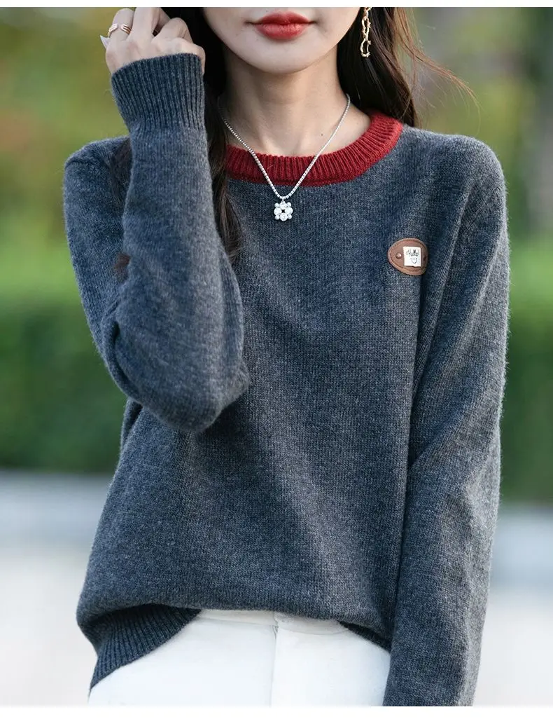 Maglione a maniche lunghe con scollo tondo in colore a contrasto per donna Camicia base esterna e lavorata a maglia alla moda e alla moda