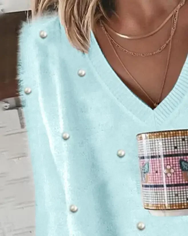 Maglione da donna 2025 Autunno Pullover lavorato a maglia a costine con scollo a V Perla a maniche lunghe Soffice Top Maglione allentato da donna