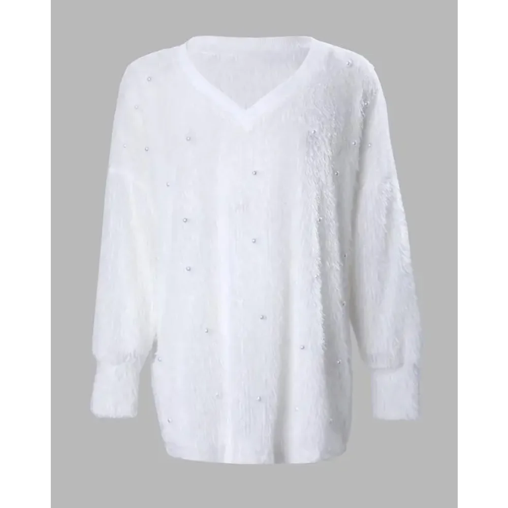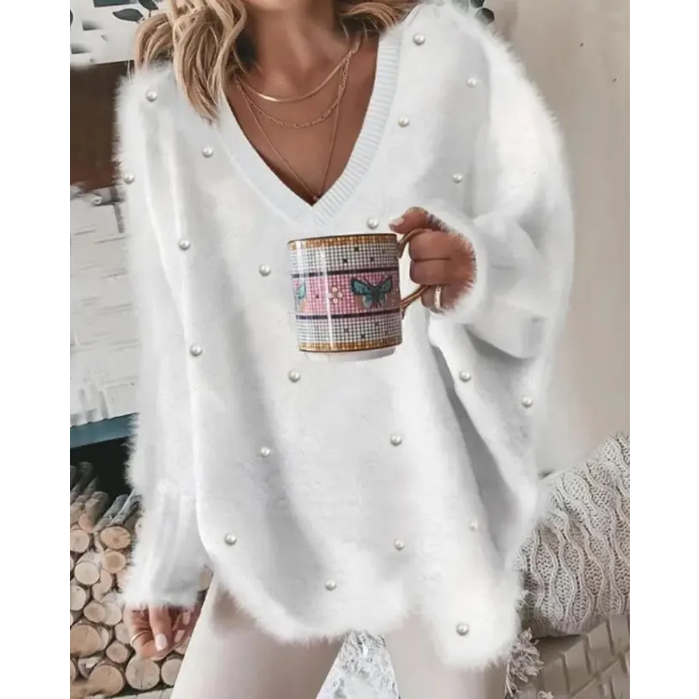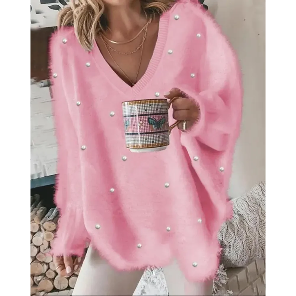 Maglione da donna 2025 Autunno Pullover lavorato a maglia a costine con scollo a V Perla a maniche lunghe Soffice Top Maglione allentato da donna