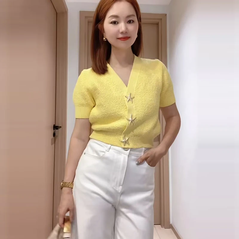 Maglione da donna Estate 2025 Nuovi top in maglia Moda Elastico Sottile scollo a V Elegante maglione confortevole Chic Street Youth Travel Tops