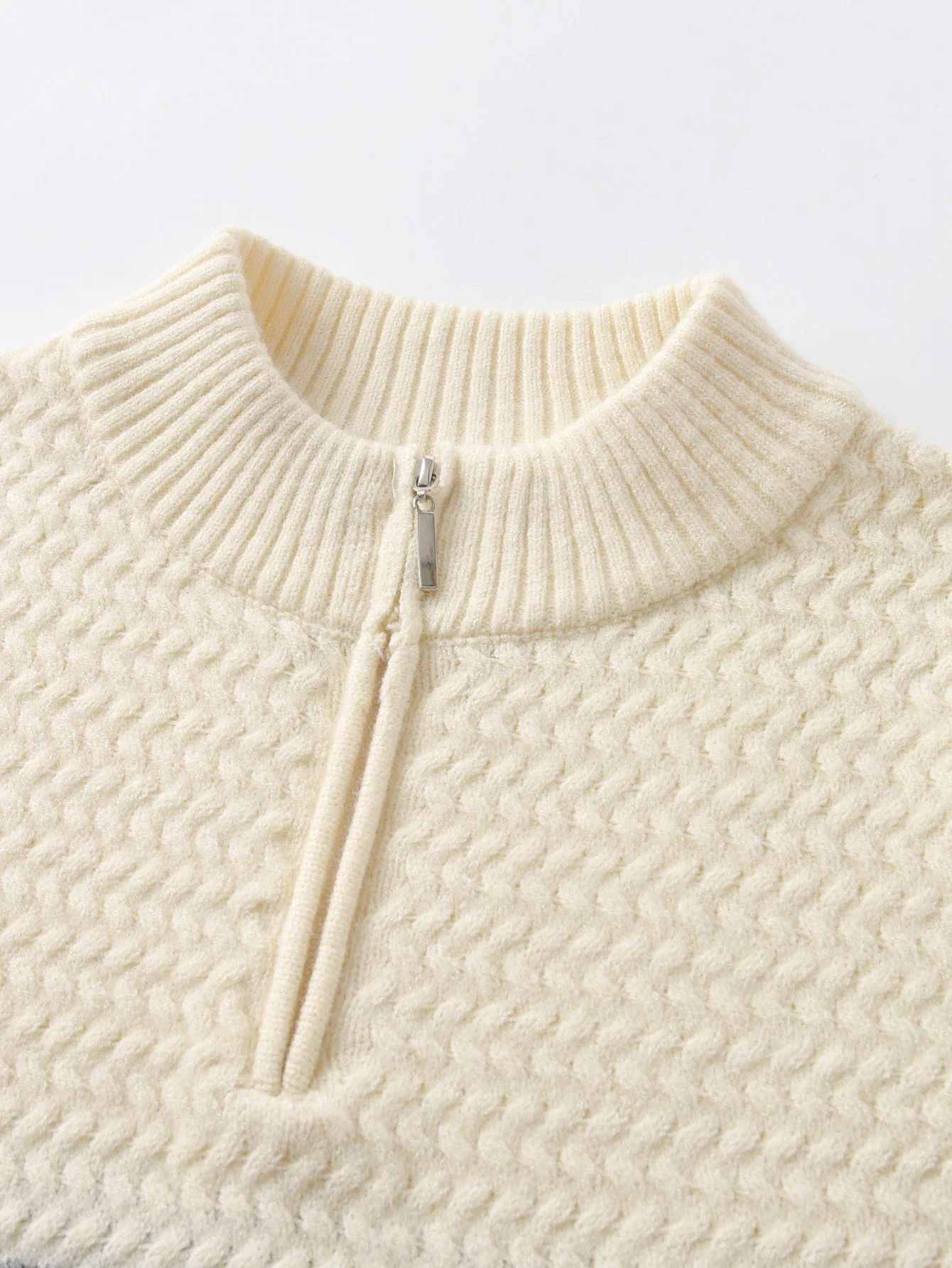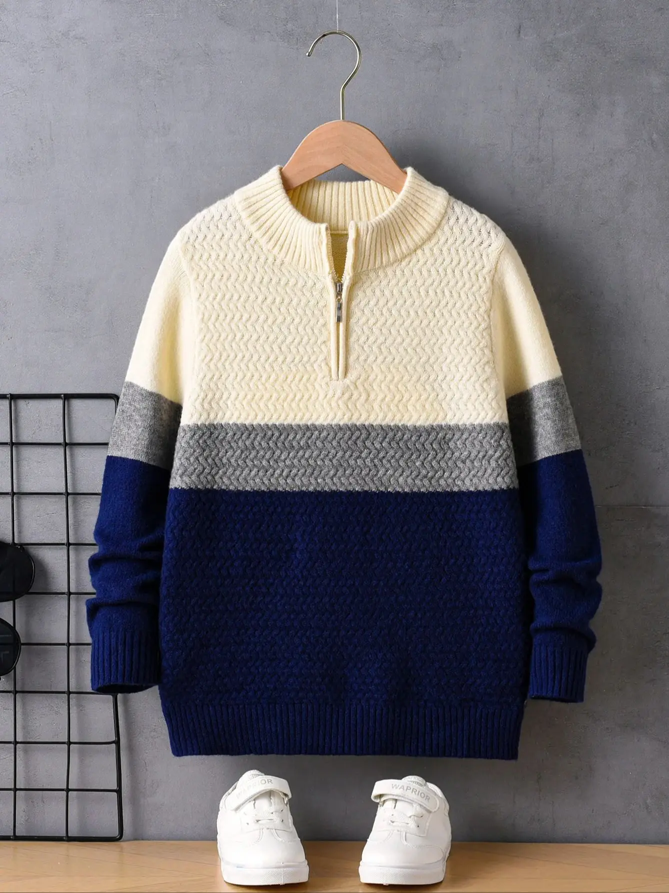 Maglione da ragazzo con mezza zip a righe colorate in stile college, colletto rialzato, pullover lavorato a maglia a maniche lunghe, adatto per la scuola quotidiana 1Maglione da ragazzo con mezza zip a righe colorate in stile college, colletto rialzato, pullover lavorato a maglia a maniche lunghe, adatto per la scuola quotidiana