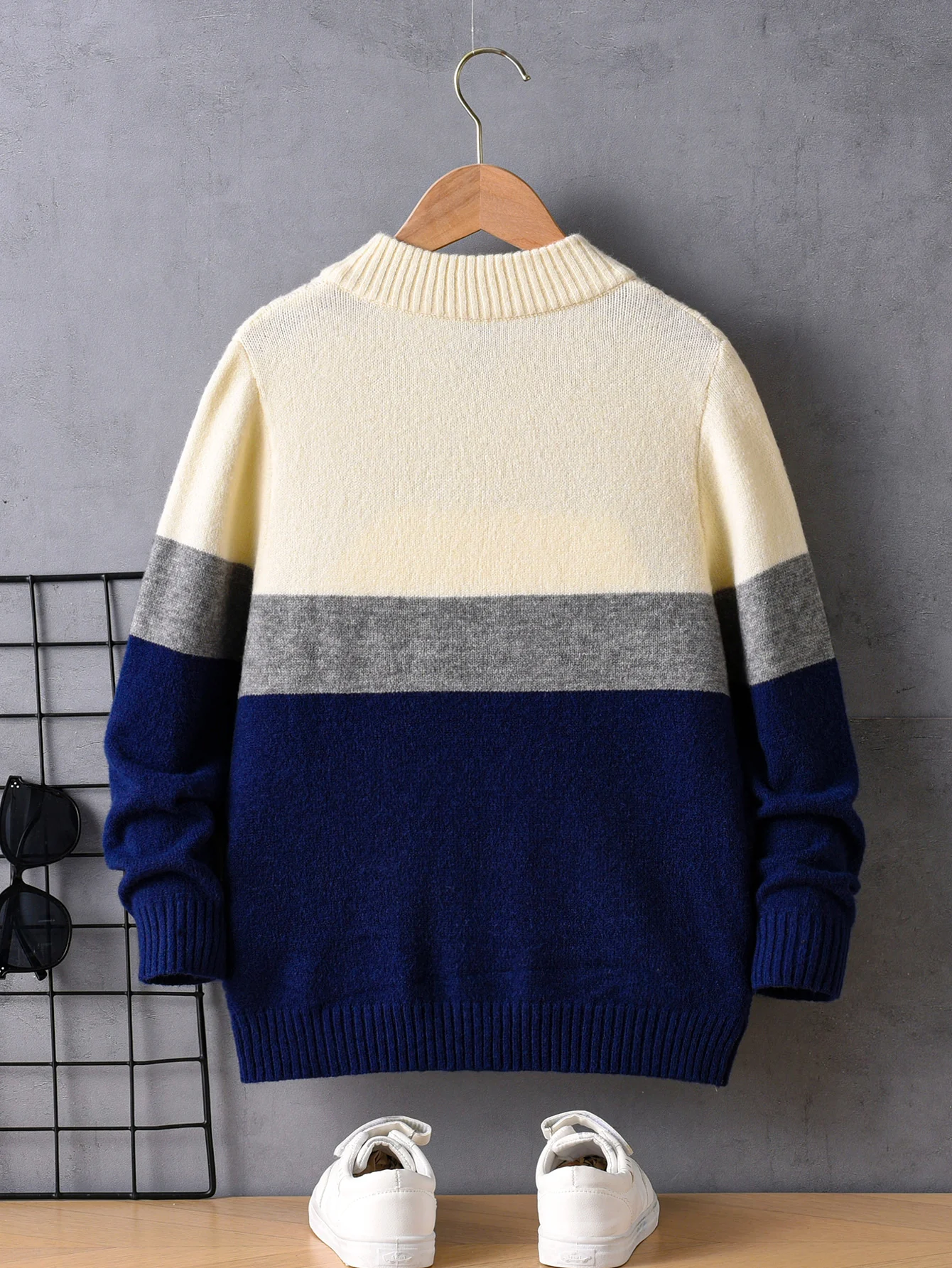 Maglione da ragazzo con mezza zip a righe colorate in stile college, colletto rialzato, pullover lavorato a maglia a maniche lunghe, adatto per la scuola quotidiana 1Maglione da ragazzo con mezza zip a righe colorate in stile college, colletto rialzato, pullover lavorato a maglia a maniche lunghe, adatto per la scuola quotidiana