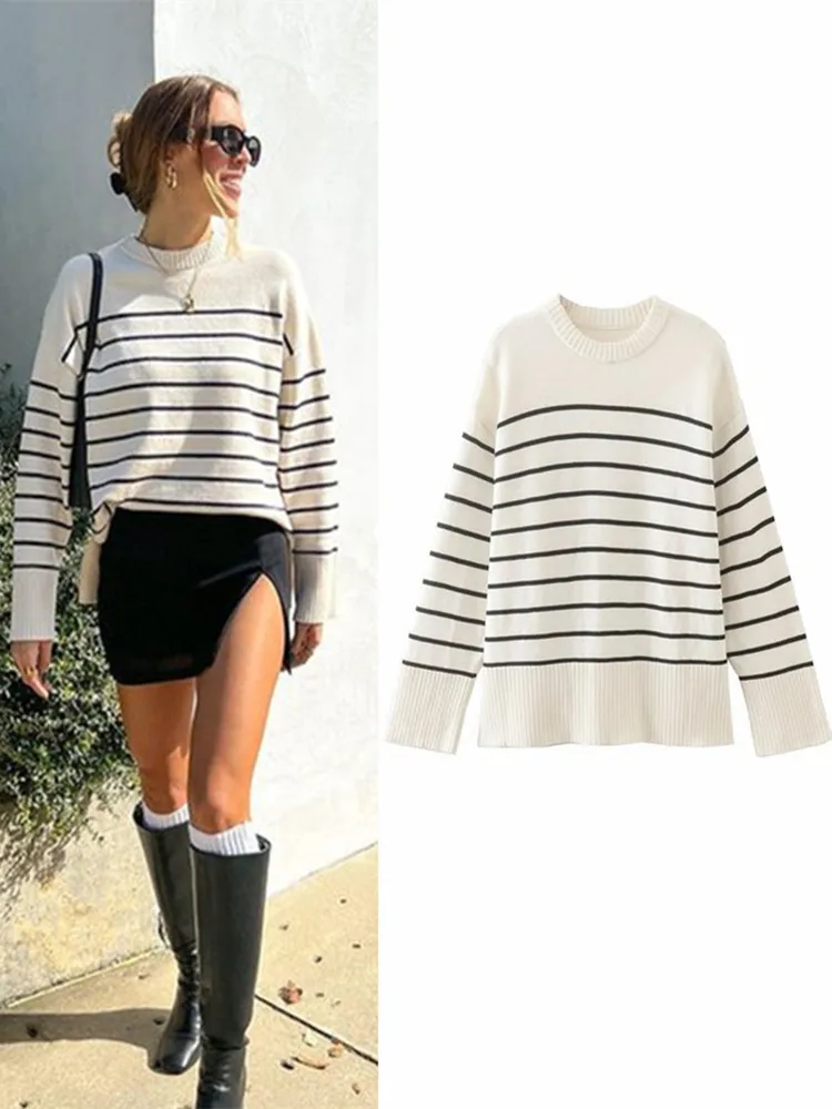 Maglione largo a righe Beige Pullover da donna Streetwear top lavorato a maglia a maniche lunghe maglione femminile autunno inverno maglioni lavorati a maglia larghi