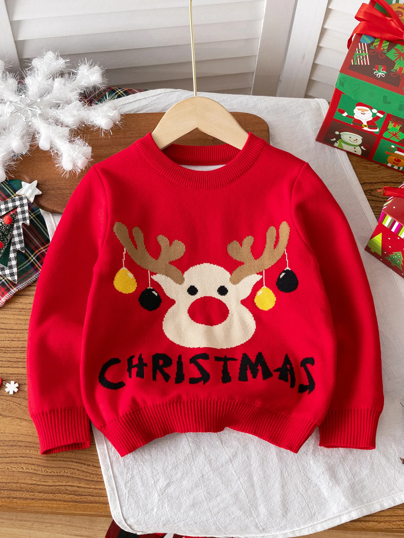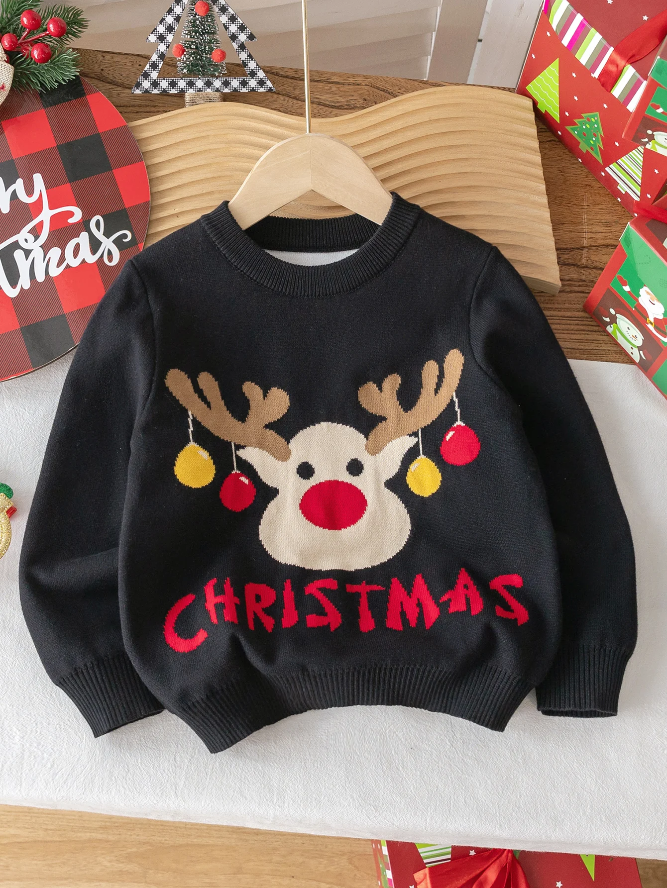 Maglione lavorato a maglia con motivo renna natalizia per ragazzi e ragazze adatto per feste di Natale in primavera, autunno e inverno