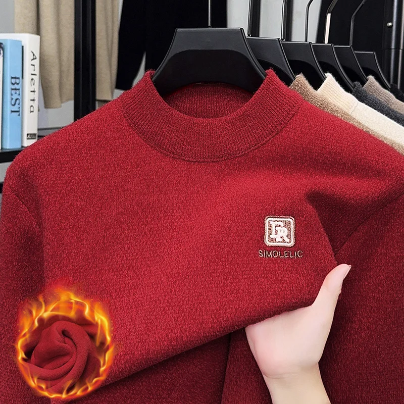 Maglione lavorato a maglia in velluto spesso a collo semi alto da uomo autunno e inverno con maglione base calda con ricamo in velluto integrato