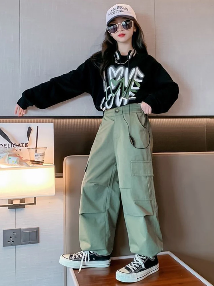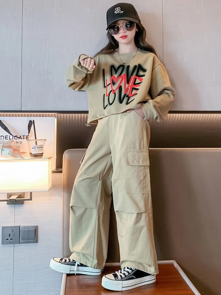 Maglione per ragazze per bambini + pantaloni cargo 2 pezzi vestito autunno set di abbigliamento per adolescenti moda lettera stampa abiti primavera nuova tuta 3-14 anni 1Maglione per ragazze per bambini + pantaloni cargo 2 pezzi vestito autunno set di abbigliamento per adolescenti moda lettera stampa abiti primavera nuova tuta 3-14 anni