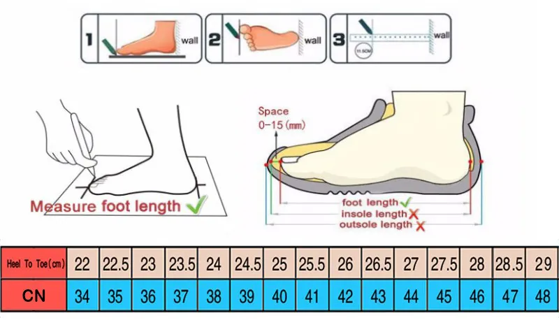 2. a causa del paese diverso le dimensioni possono essere leggermente diverse, quindi quando si effettua l’ordine. Si prega di scegliere la lunghezza del piede in base alle dimensioni, se il grasso del piede o la larghezza, è possibile acquistare la taglia unica più grande, grazie!