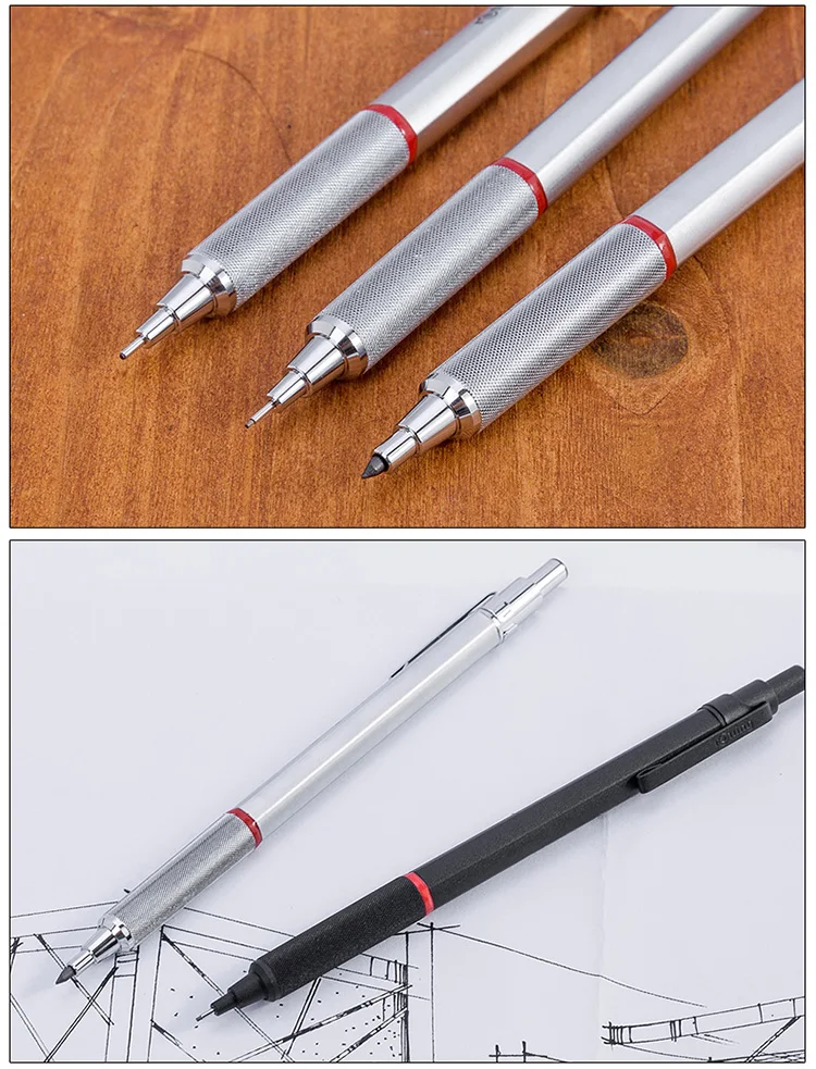 Sliding sleeve and cushion lead mechanism for high level of break resistance and outstanding writing and doodling comfort. Full metal body providing ideal balance of weight, with non-slip metal knurled grip. Unique push mechanism for controlled 2.0 mm lead transportation. Built-in sharpener under the push-button cap.