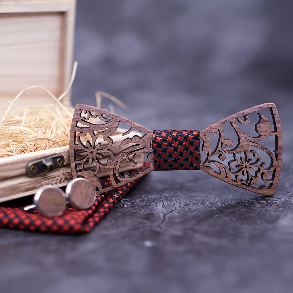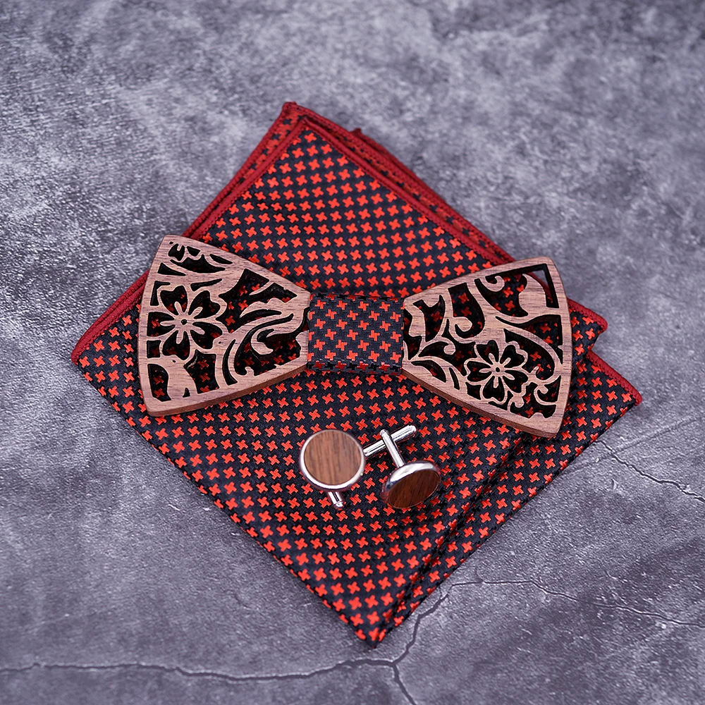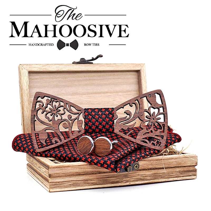 Papillon in legno, fazzoletti, gemelli in legno e un’elegante confezione regalo.
