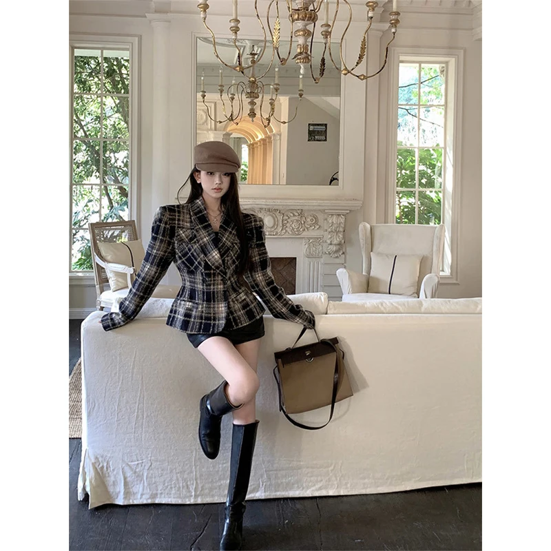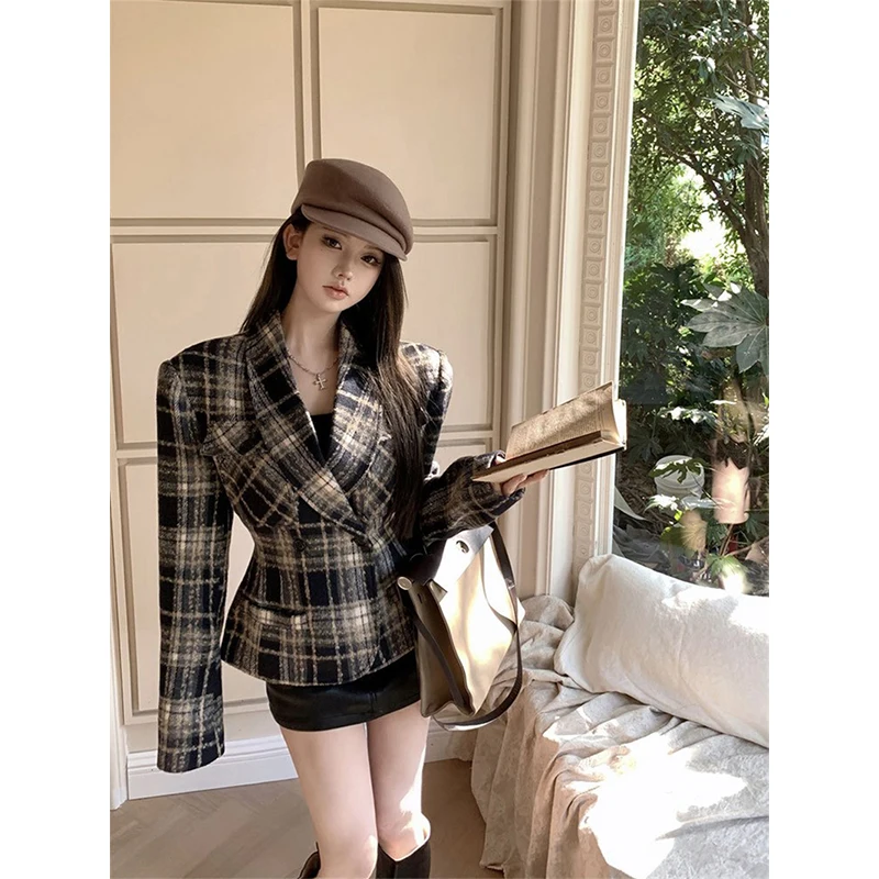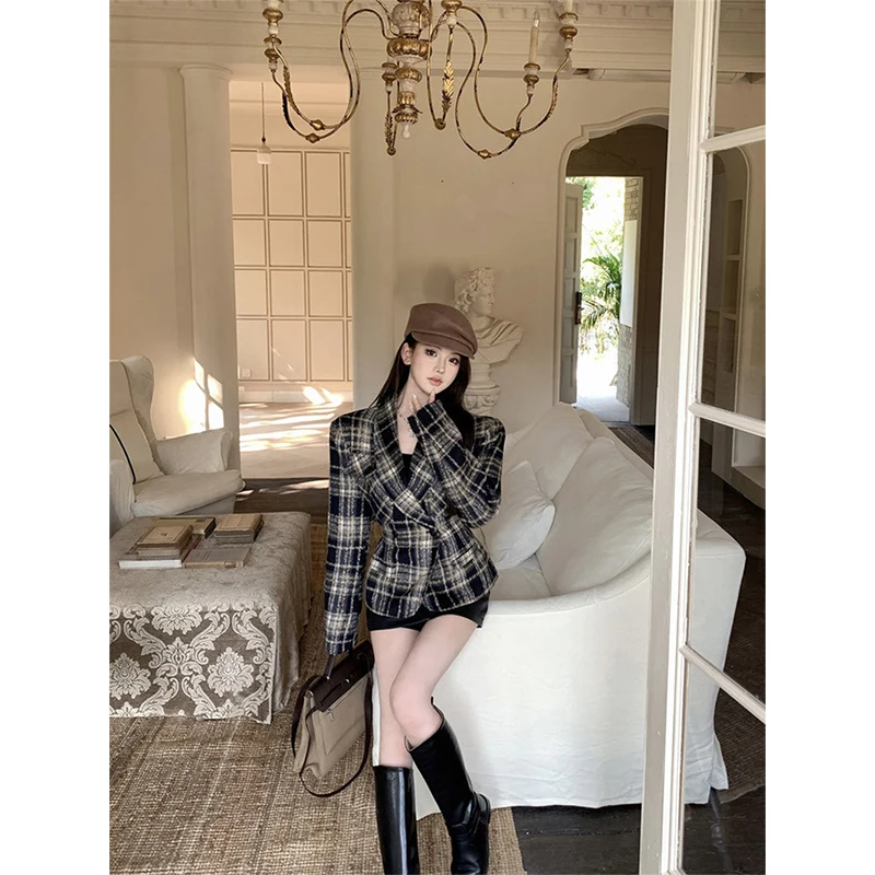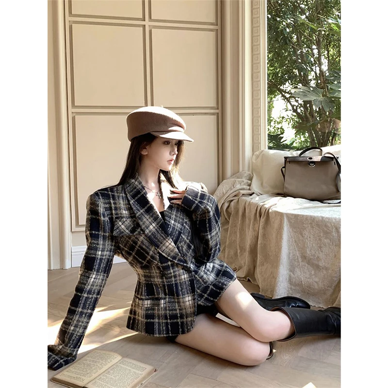 MEXZT Cappotti in misto lana scozzese Donna Giacche di lana trapuntate corte vintage Elegante giacca con cintura Capispalla coreano Cappotto invernale