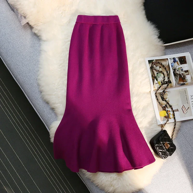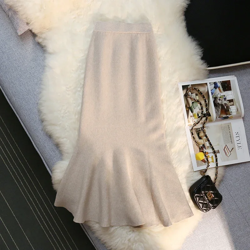 MEXZT Gonne lunghe in maglia vintage Gonna a sirena sottile a vita alta elastica da donna Autunno Inverno Gonne a tromba solide eleganti coreane Novità