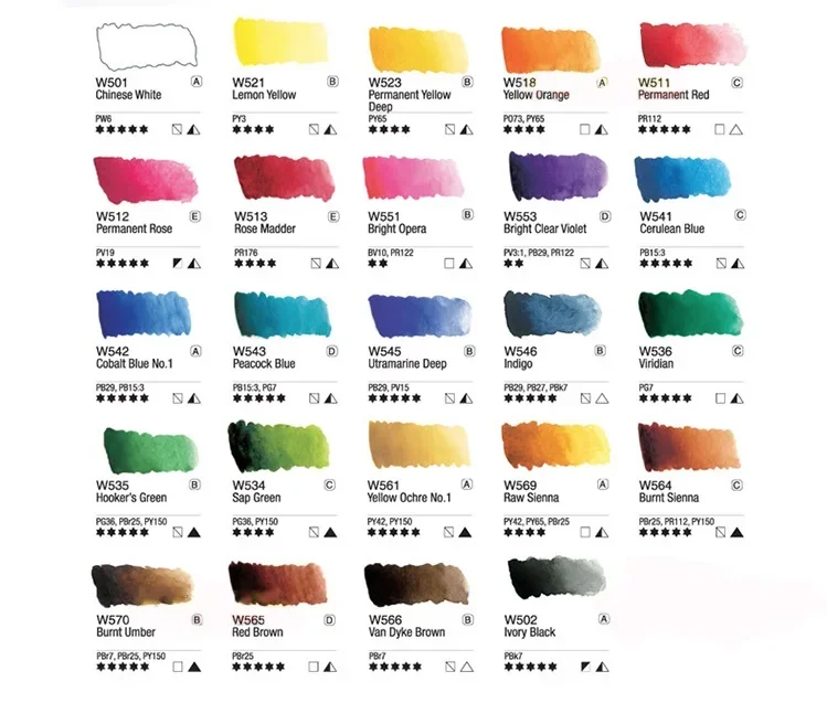 Set 24 colori – W501-Bianco cinese, W521-Giallo limone, W523-Giallo profondo, W518-Giallo arancione, W511 Rosso permanente, W512-Rosa permanente, W513-Rosa madre, W551-Opera brillante, W553-Viola trasparente brillante, W541-Blu cerulean, W542-Blu cobalto n. 1, W543-Blu pavone, W545 Utramarine profondo, W51-Verde rosso-marrone, W