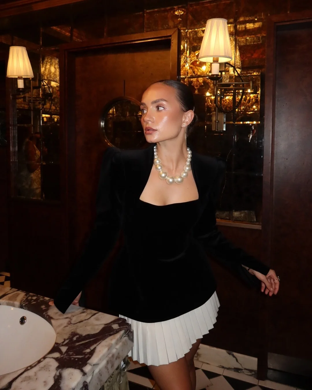 Mini abito a trapezio a contrasto da donna elegante con scollo quadrato Moda abiti a maniche lunghe pieghettati a vita alta 2024 New Lady Chic Partywear 1Mini abito a trapezio a contrasto da donna elegante con scollo quadrato Moda abiti a maniche lunghe pieghettati a vita alta 2024 New Lady Chic Partywear