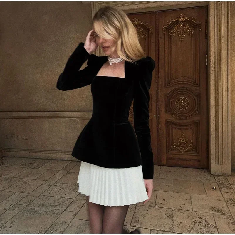Mini abito a trapezio a contrasto da donna elegante con scollo quadrato Moda abiti a maniche lunghe pieghettati a vita alta 2024 New Lady Chic Partywear