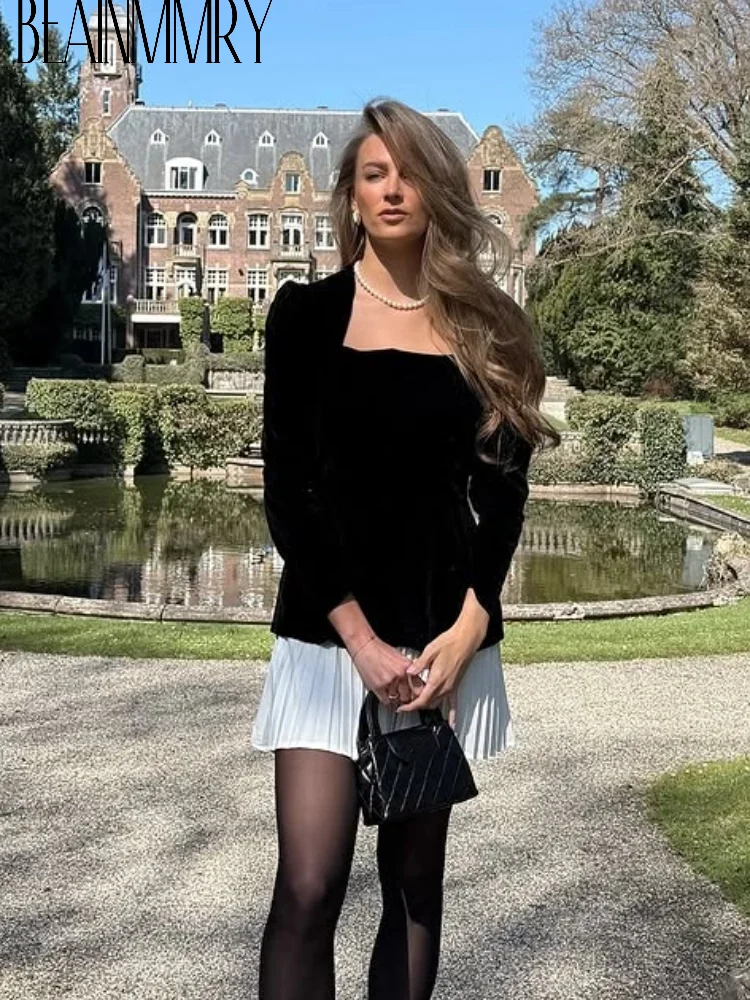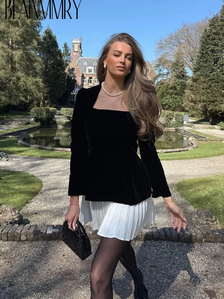 Mini abito a trapezio a contrasto da donna elegante con scollo quadrato Moda abiti a maniche lunghe pieghettati a vita alta 2024 New Lady Chic Partywear