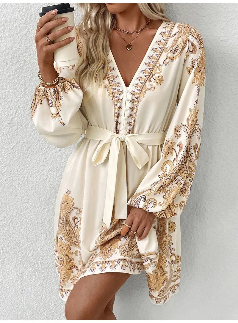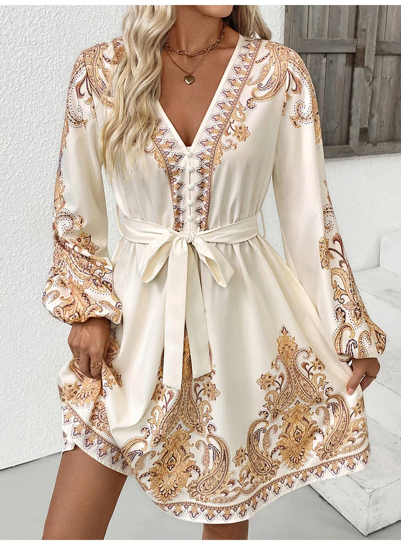 Nuovo abito a maniche lunghe con motivo geometrico per donna, autunno/inverno, abito circolare a maniche lunghe con scollo a V da donna – Abito longuette elegante
