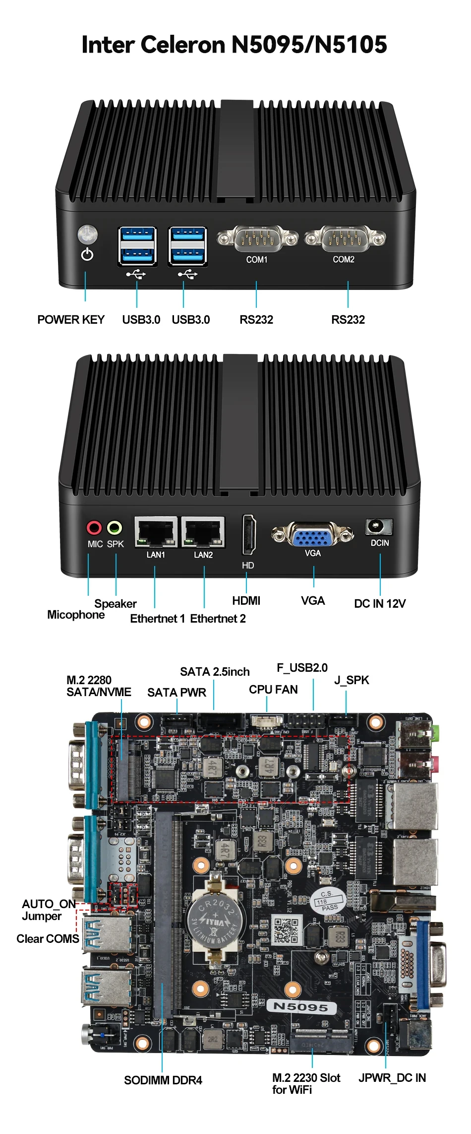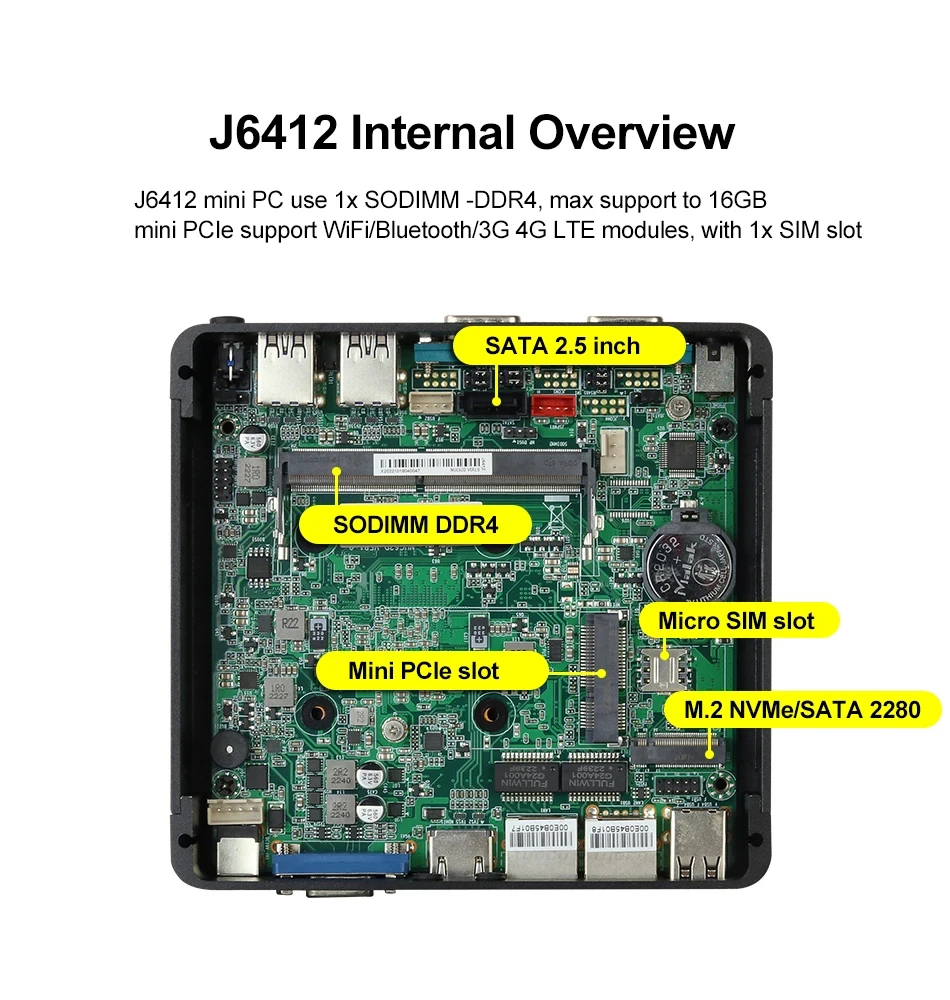 – RAM e archiviazione flessibili, 1 slot per memoria, supporto massimo a 8 GB; Il modello J6412 supporta uno SSD M.2 NVME/SATA e un HDD/SSD da 2,5 pollici, altri modelli supportano uno SSD mSATA e un SSD/HDD da 2,5 pollici;