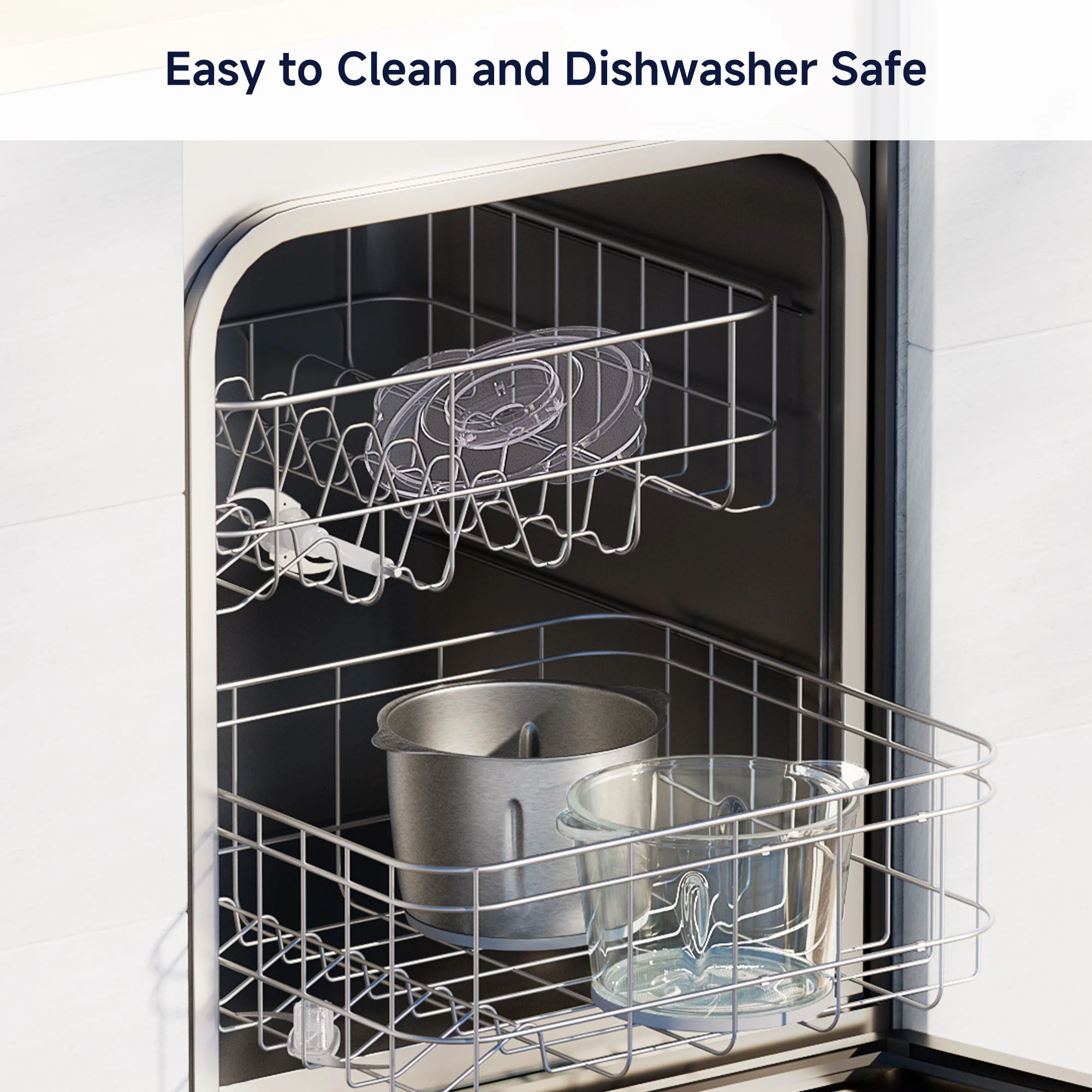 Design della lama a scatto con strati rimovibili.Include ciotole in acciaio inossidabile + vetro per versatilità.