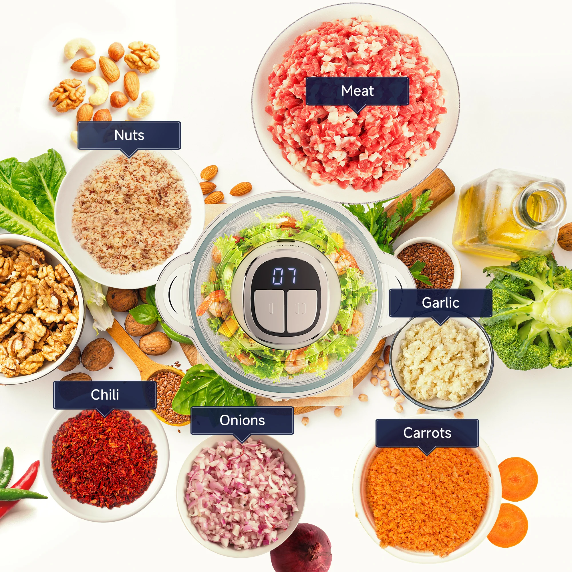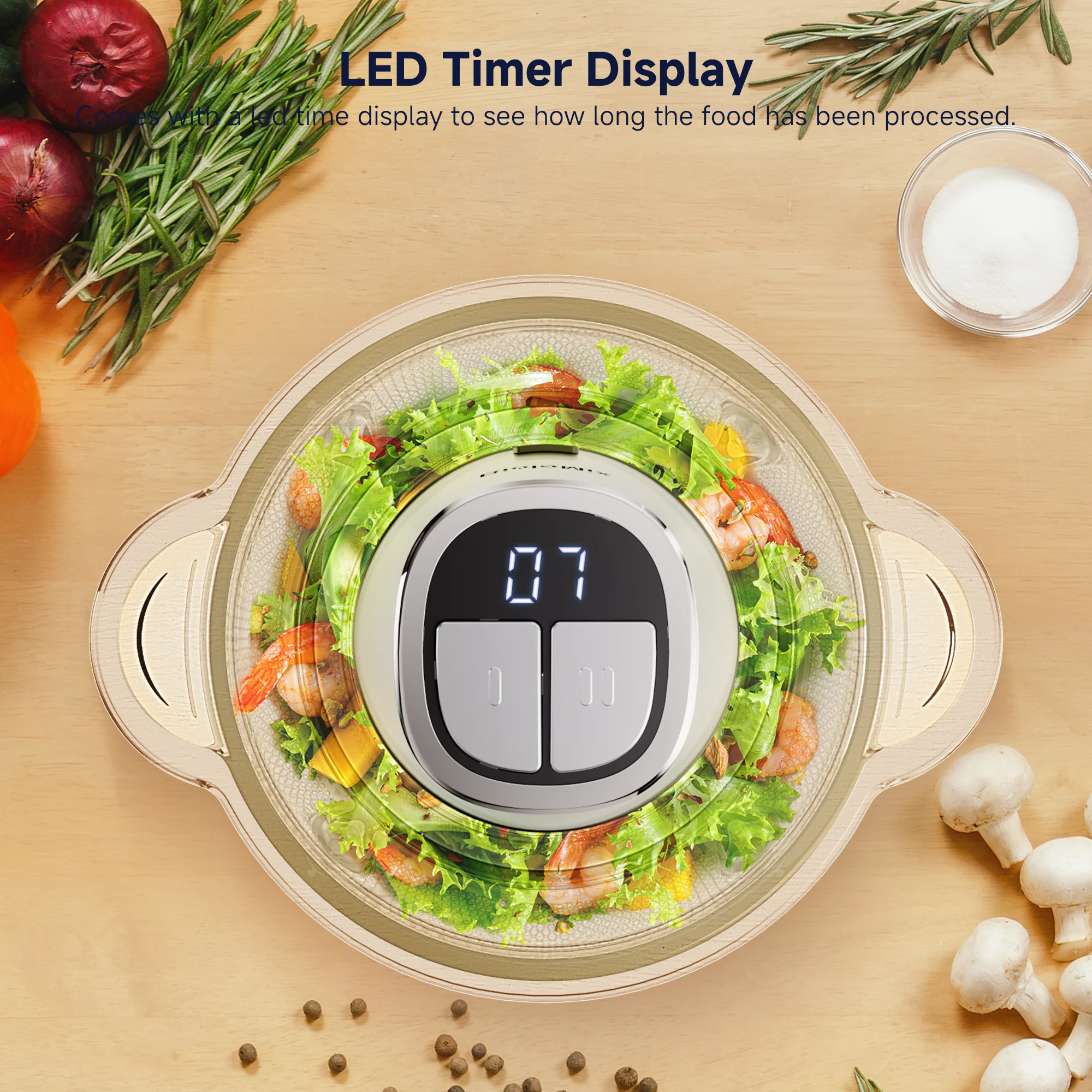Elabora fino a 1 kg di ingredienti.Dispone di un tappetino in gomma antiscivolo per stabilità e una ciotola lavabile in lavastoviglie per una facile pulizia.