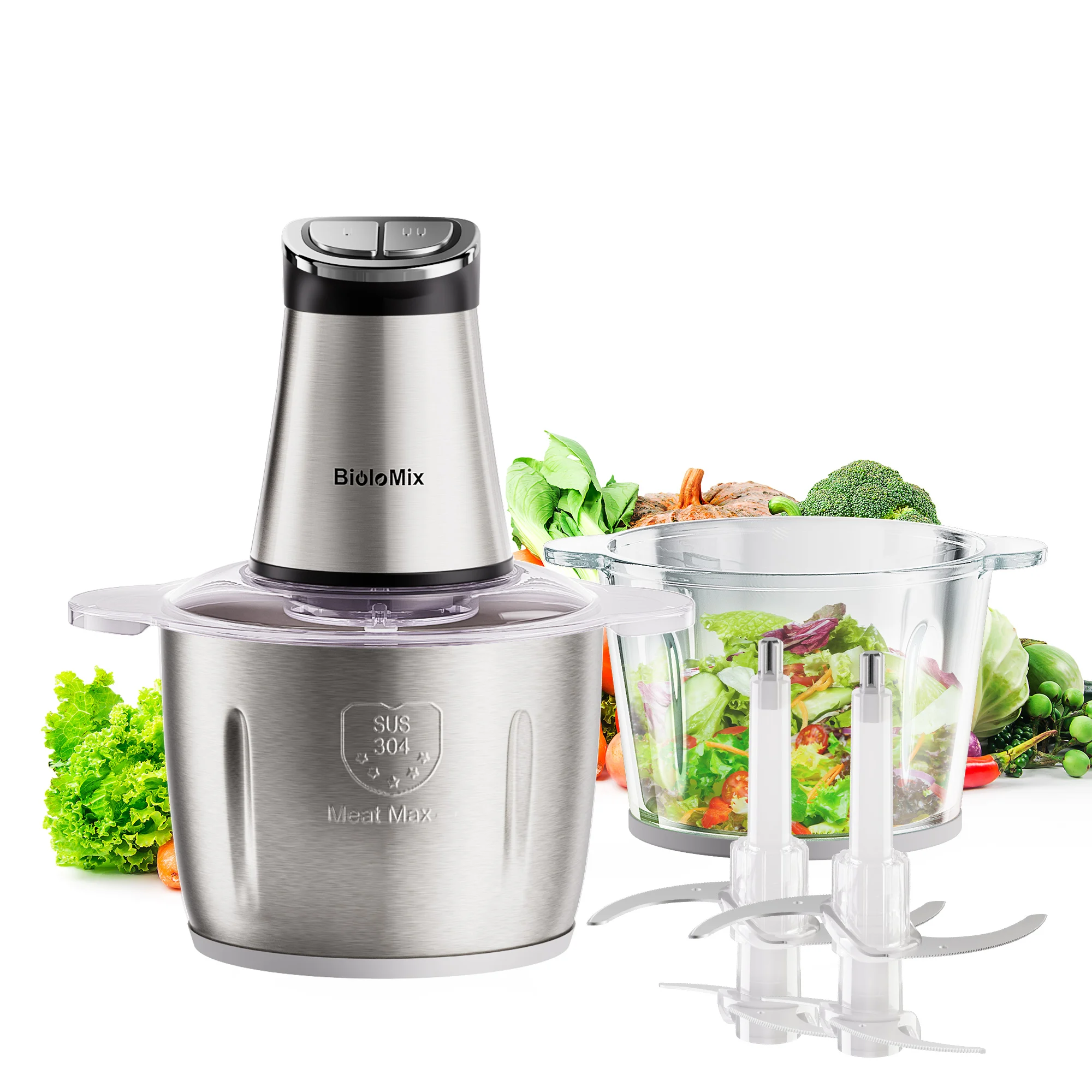 Design della lama a scatto con strati rimovibili.Include ciotole in acciaio inossidabile + vetro per versatilità.