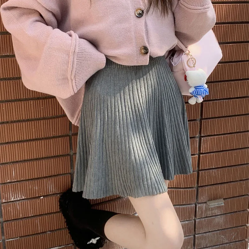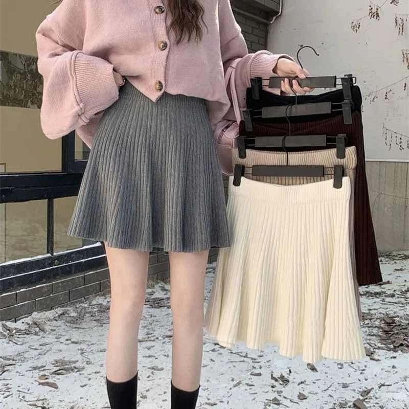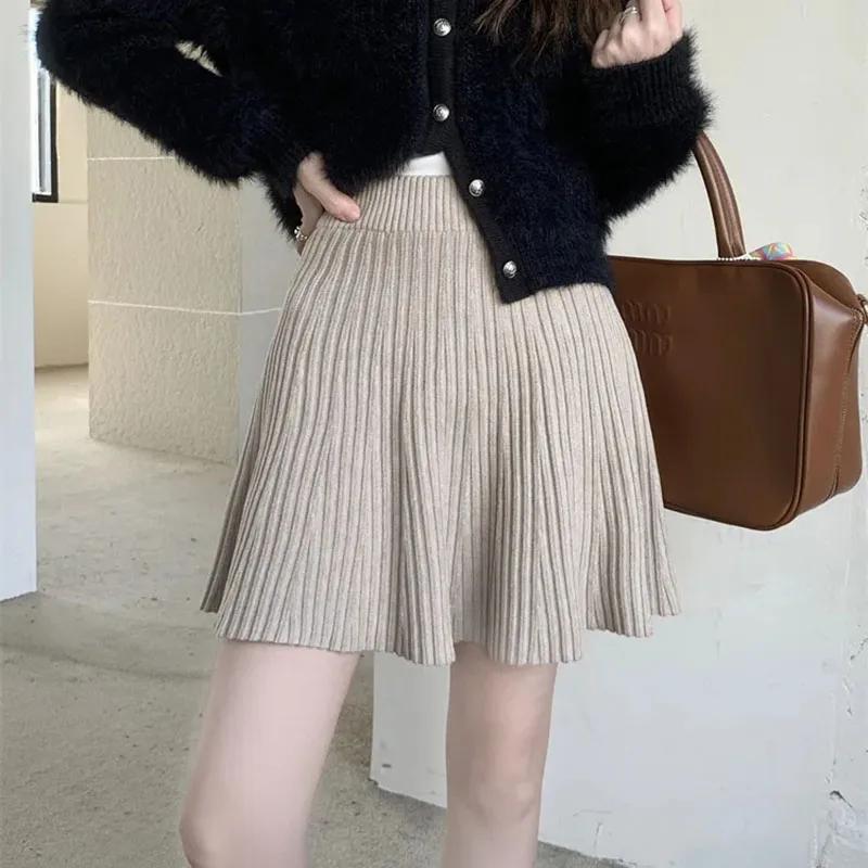Minigonne a pieghe tutto-fiammifero in tinta unita Donna Autunno Inverno Gonne in maglia dimagranti a vita alta Gonna a trapezio basic casual semplice