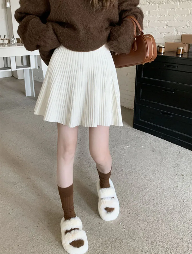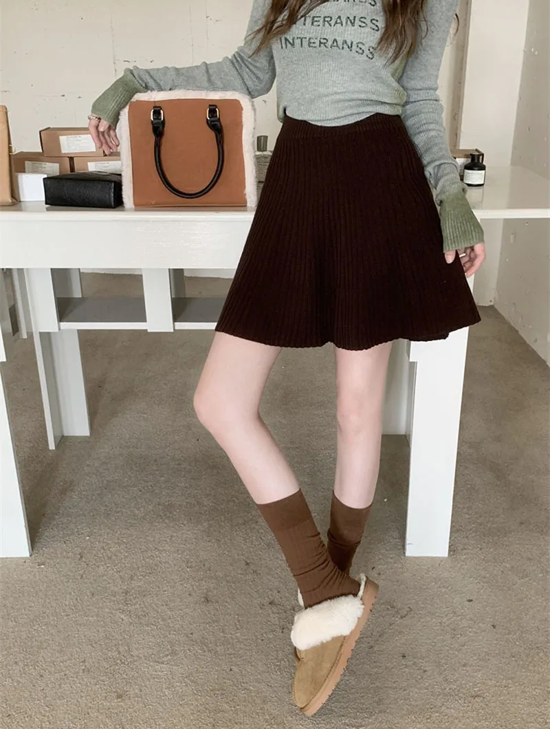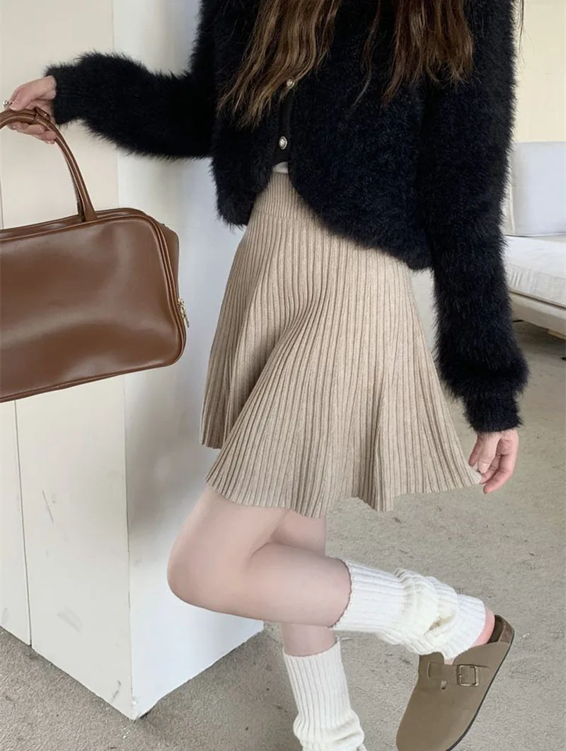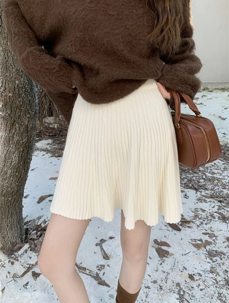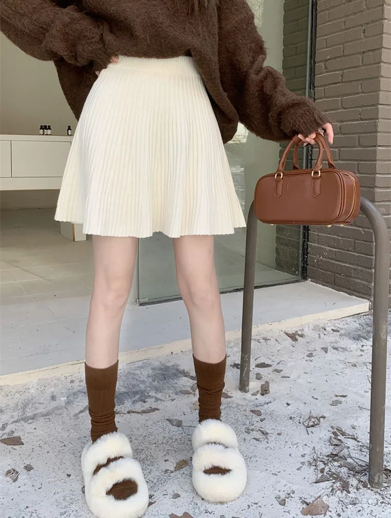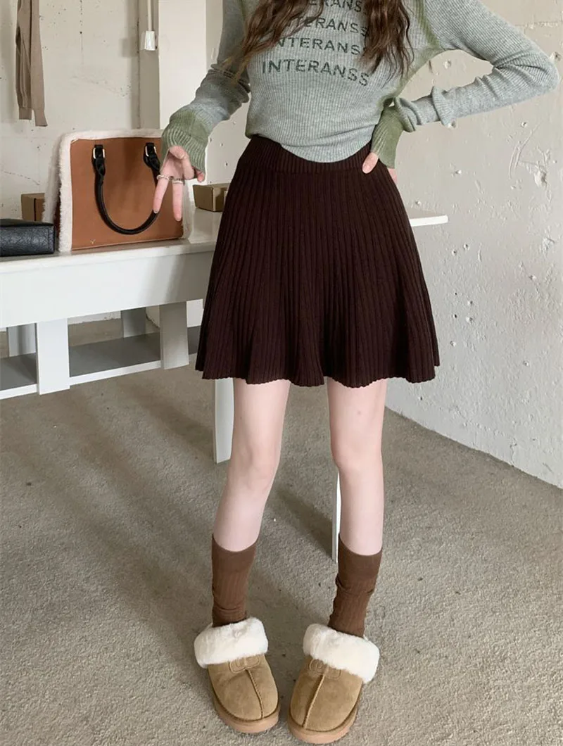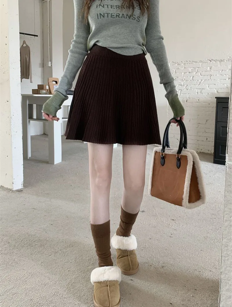 Minigonne a pieghe tutto-fiammifero in tinta unita Donna Autunno Inverno Gonne in maglia dimagranti a vita alta Gonna a trapezio basic casual semplice