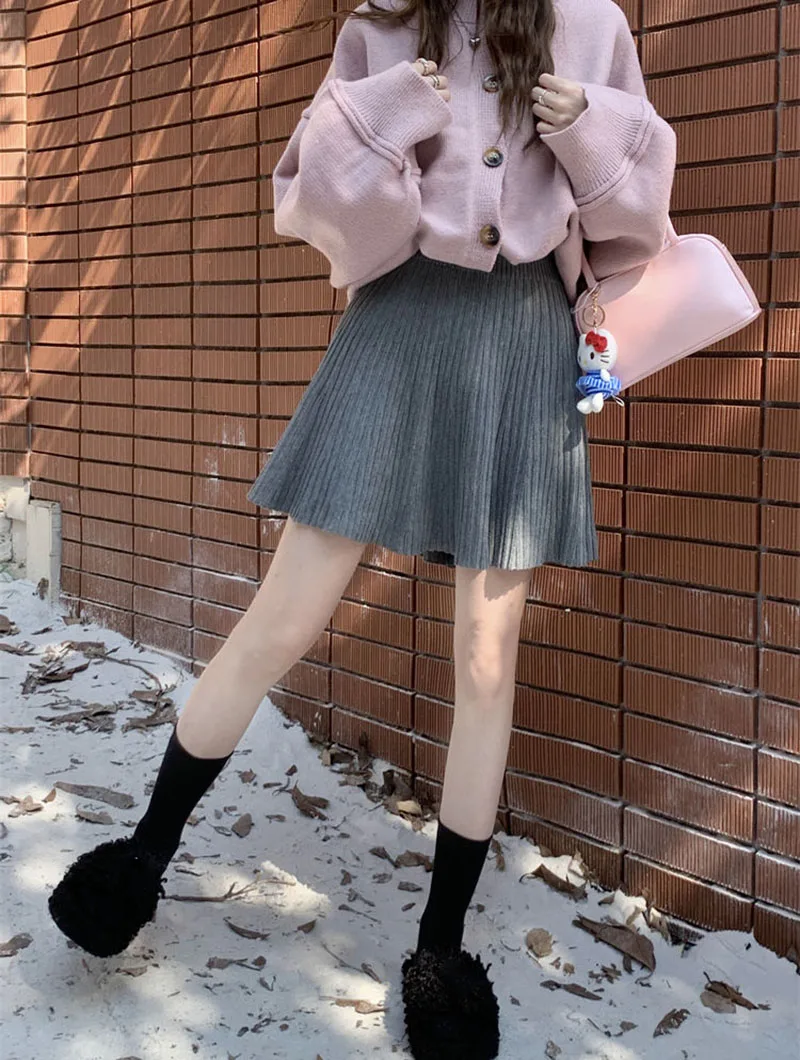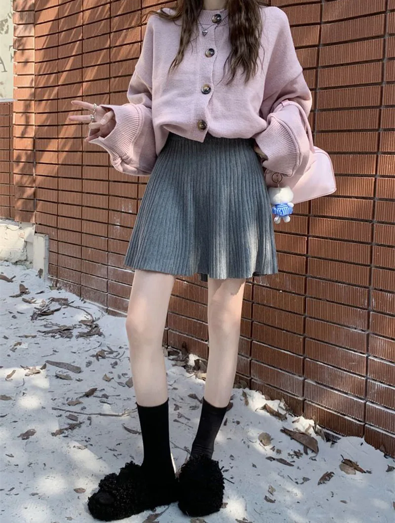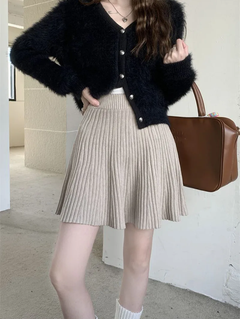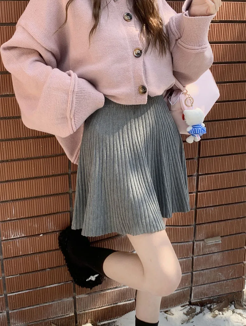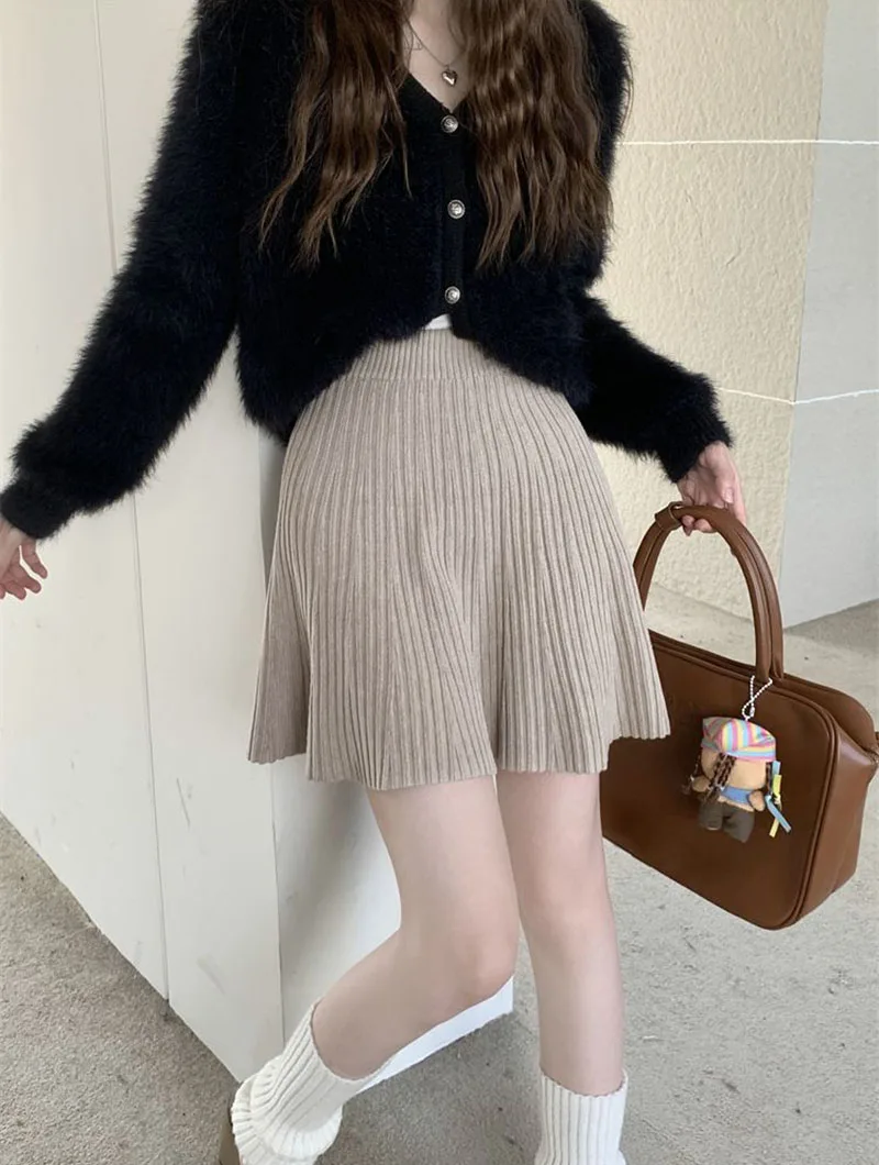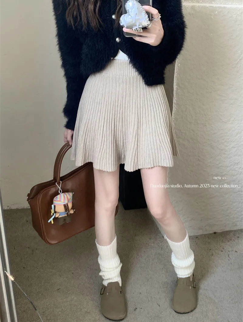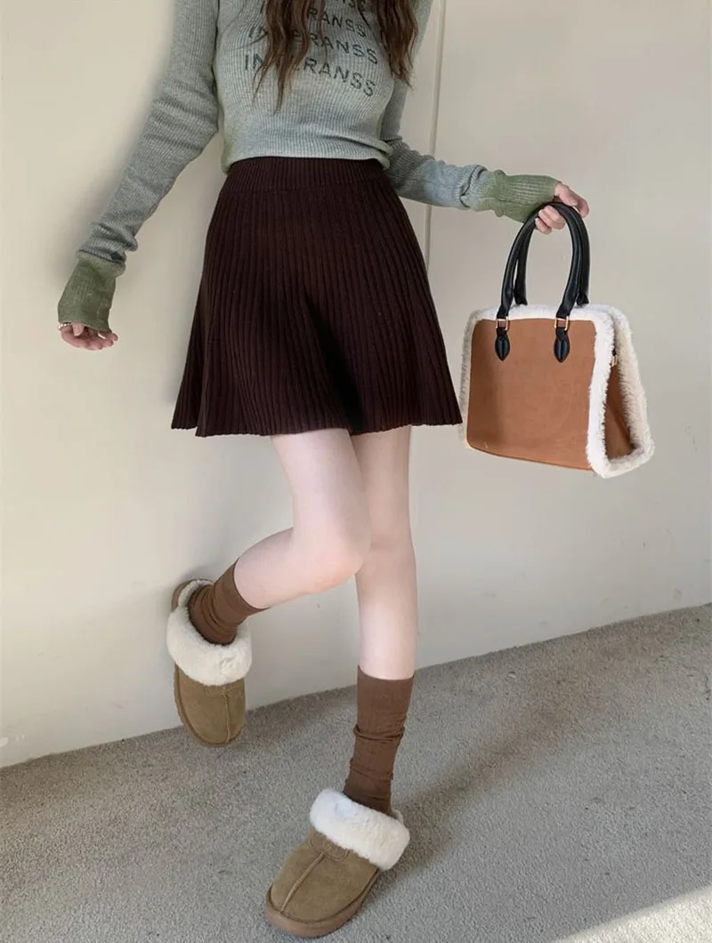 Minigonne a pieghe tutto-fiammifero in tinta unita Donna Autunno Inverno Gonne in maglia dimagranti a vita alta Gonna a trapezio basic casual semplice