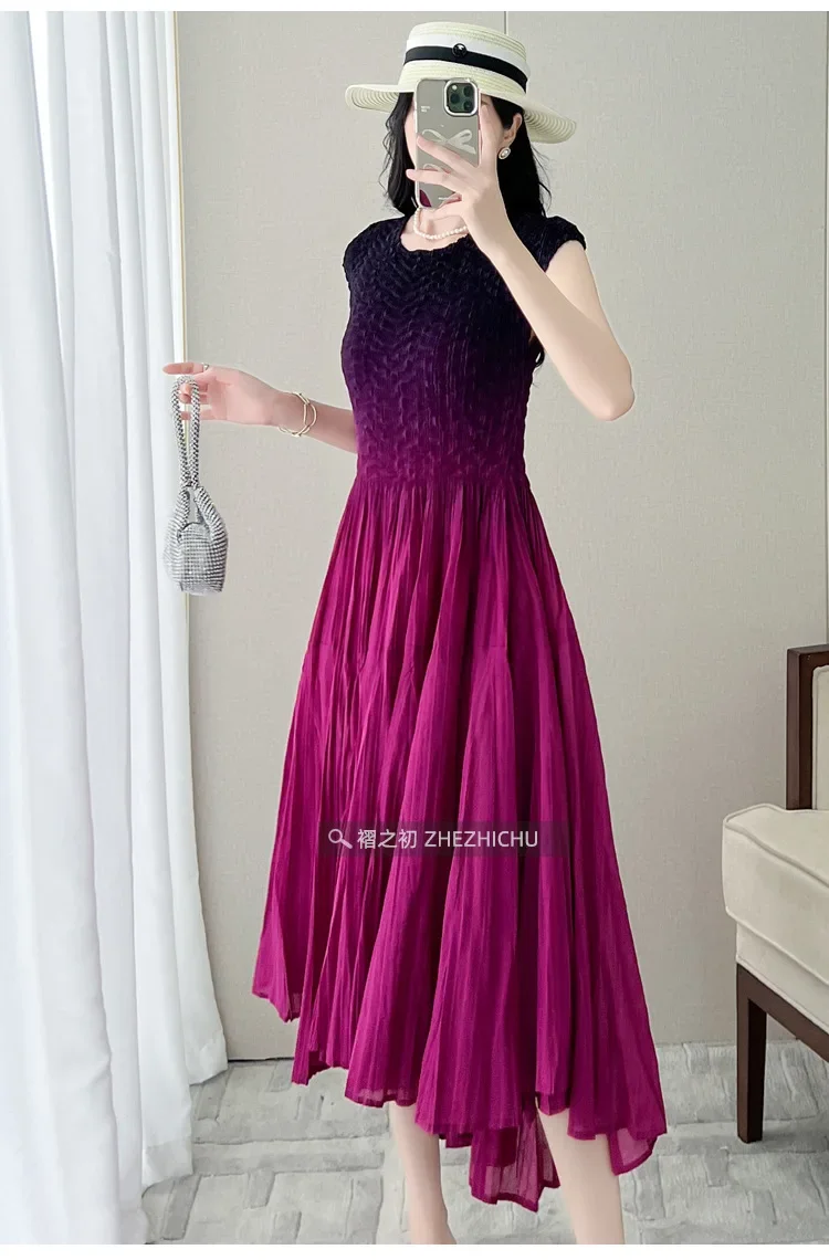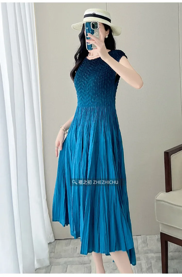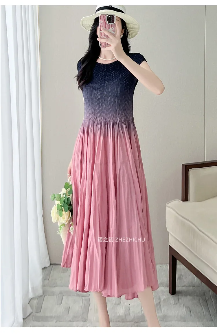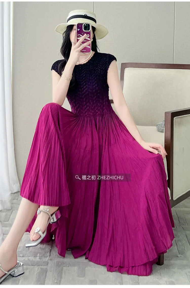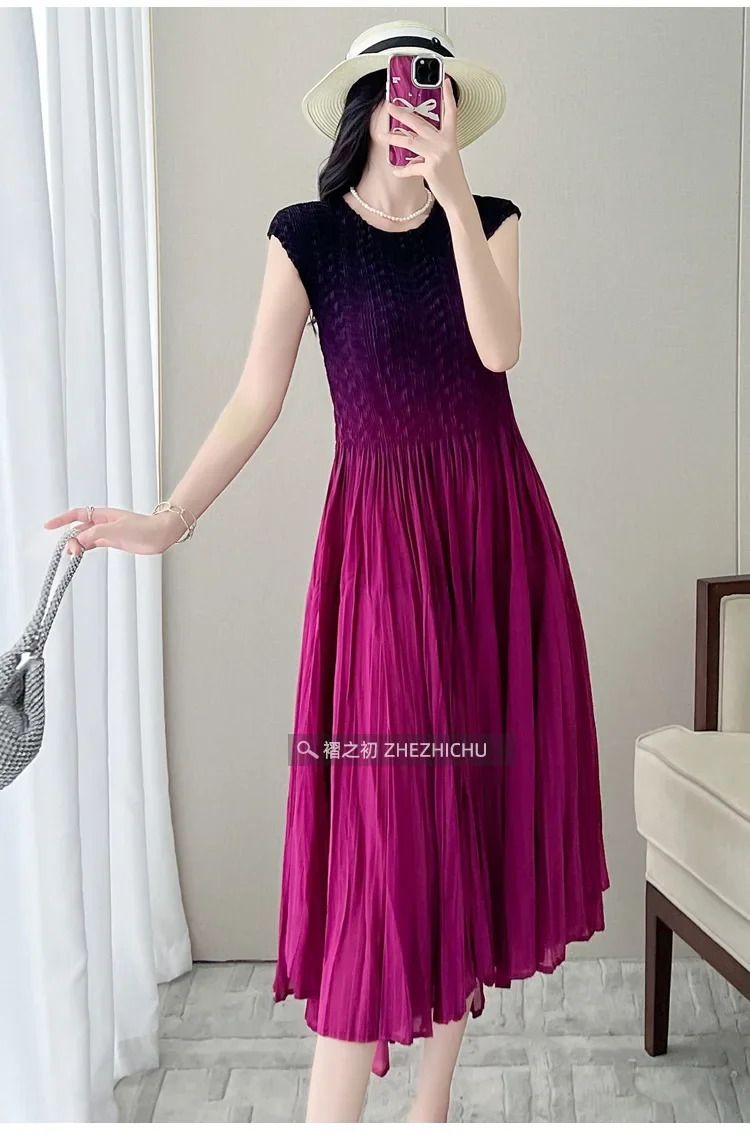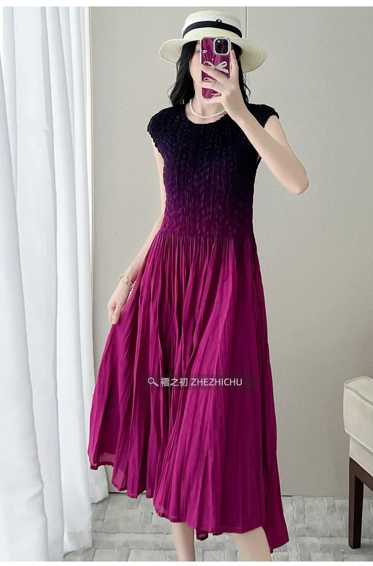Miyake Abito elegante a pieghe Donna 2025 Nuovo colore sfumato Slim Girocollo senza maniche Temperamento Gonna lunga a pieghe impiombata