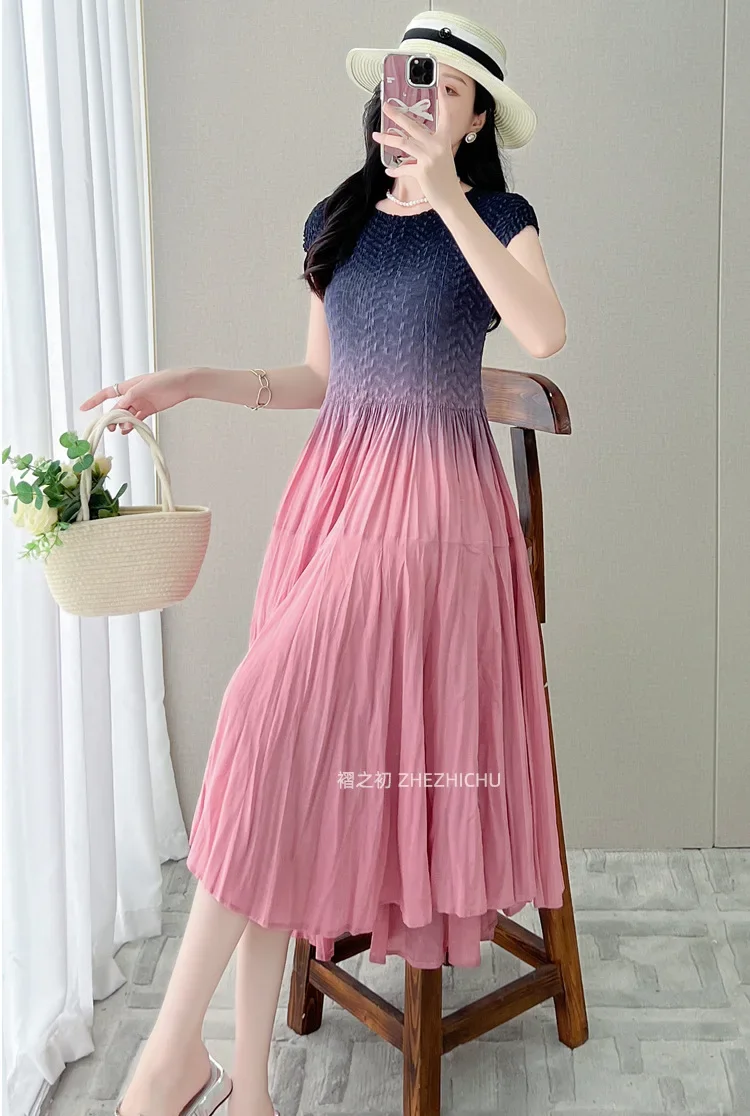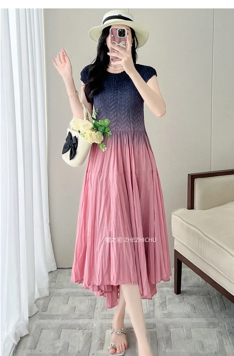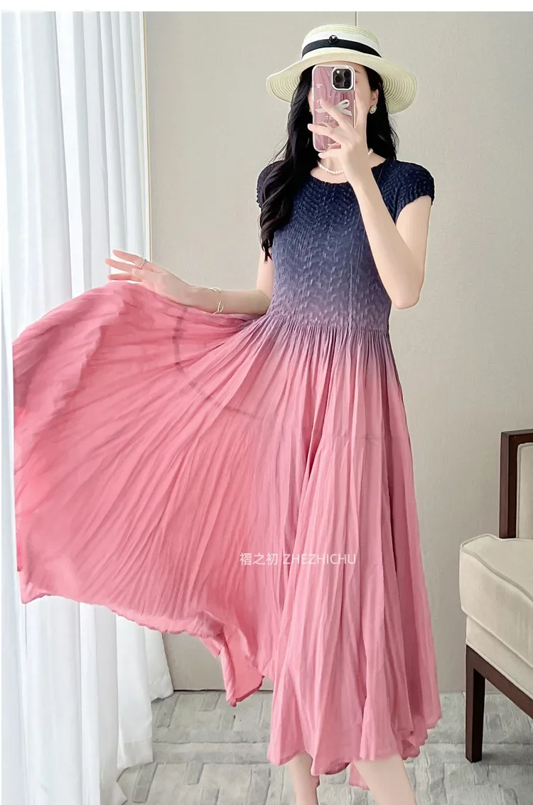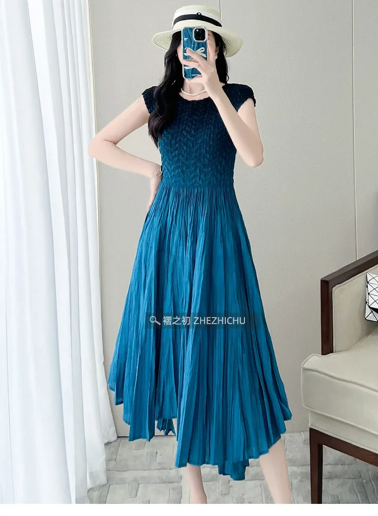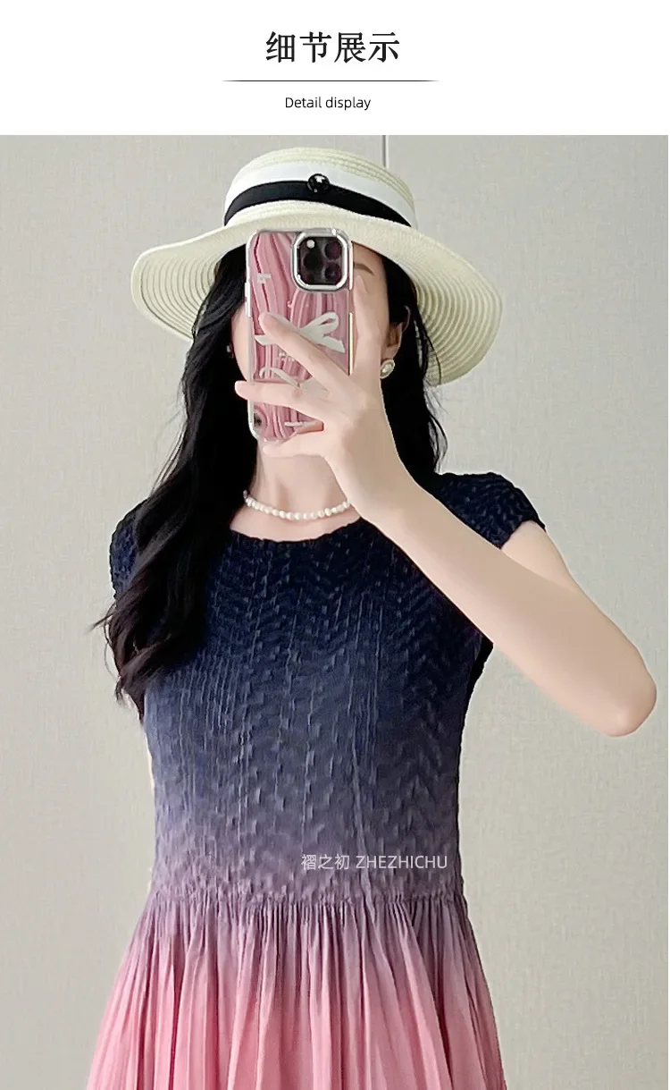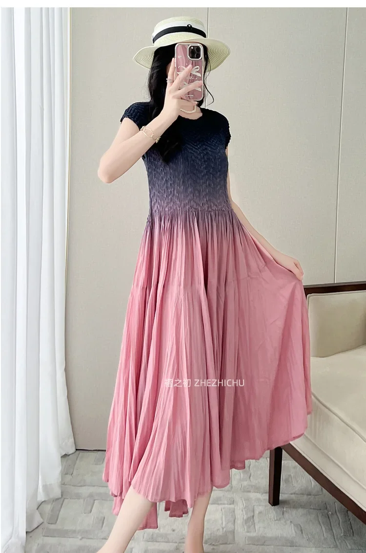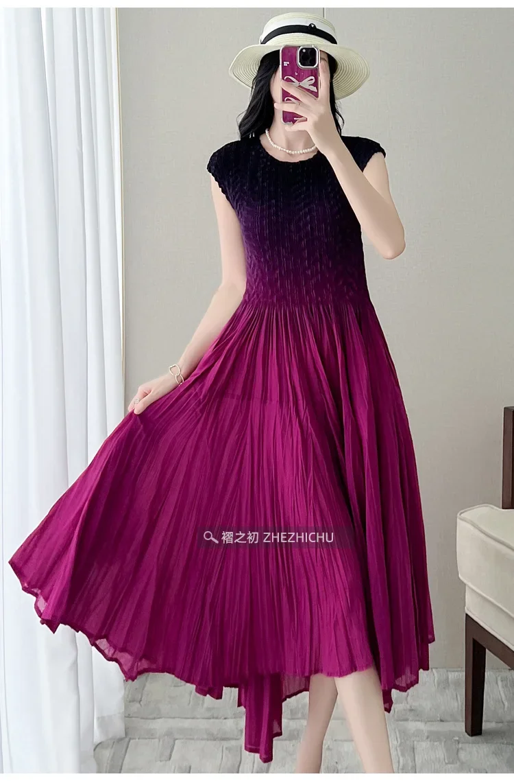 Miyake Abito elegante a pieghe Donna 2025 Nuovo colore sfumato Slim Girocollo senza maniche Temperamento Gonna lunga a pieghe impiombata