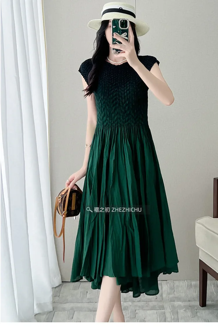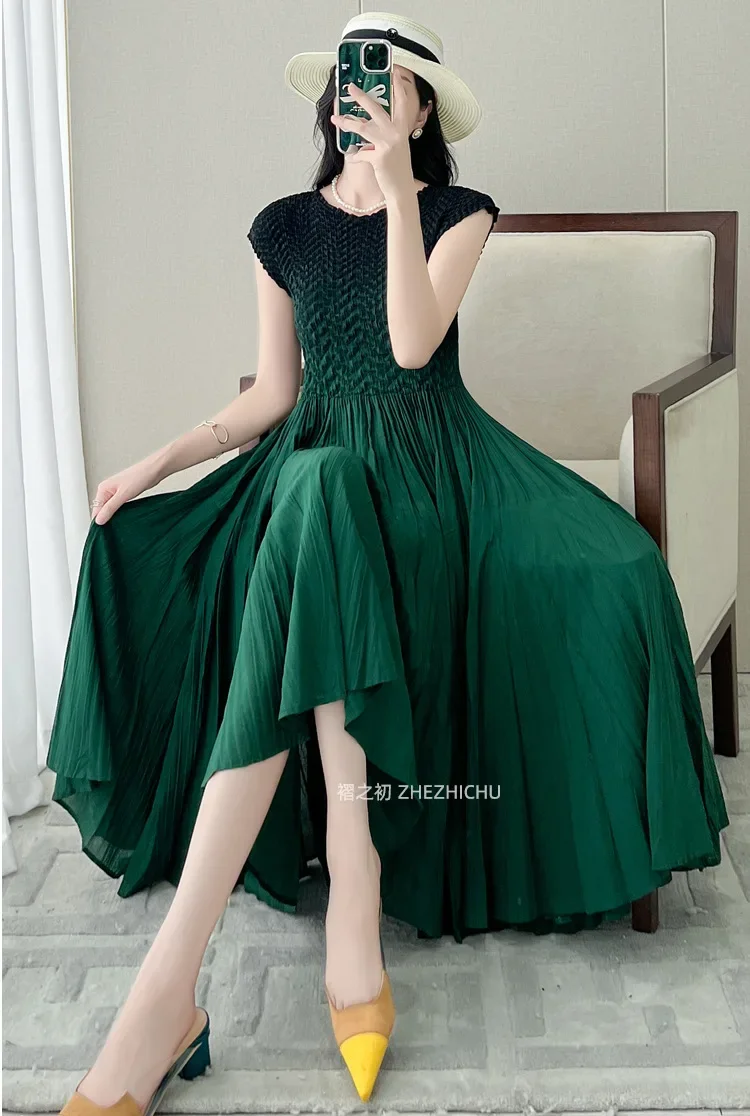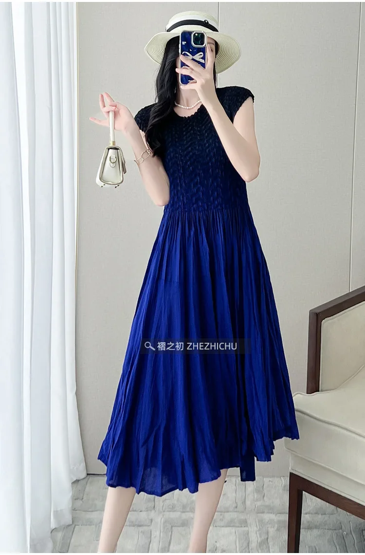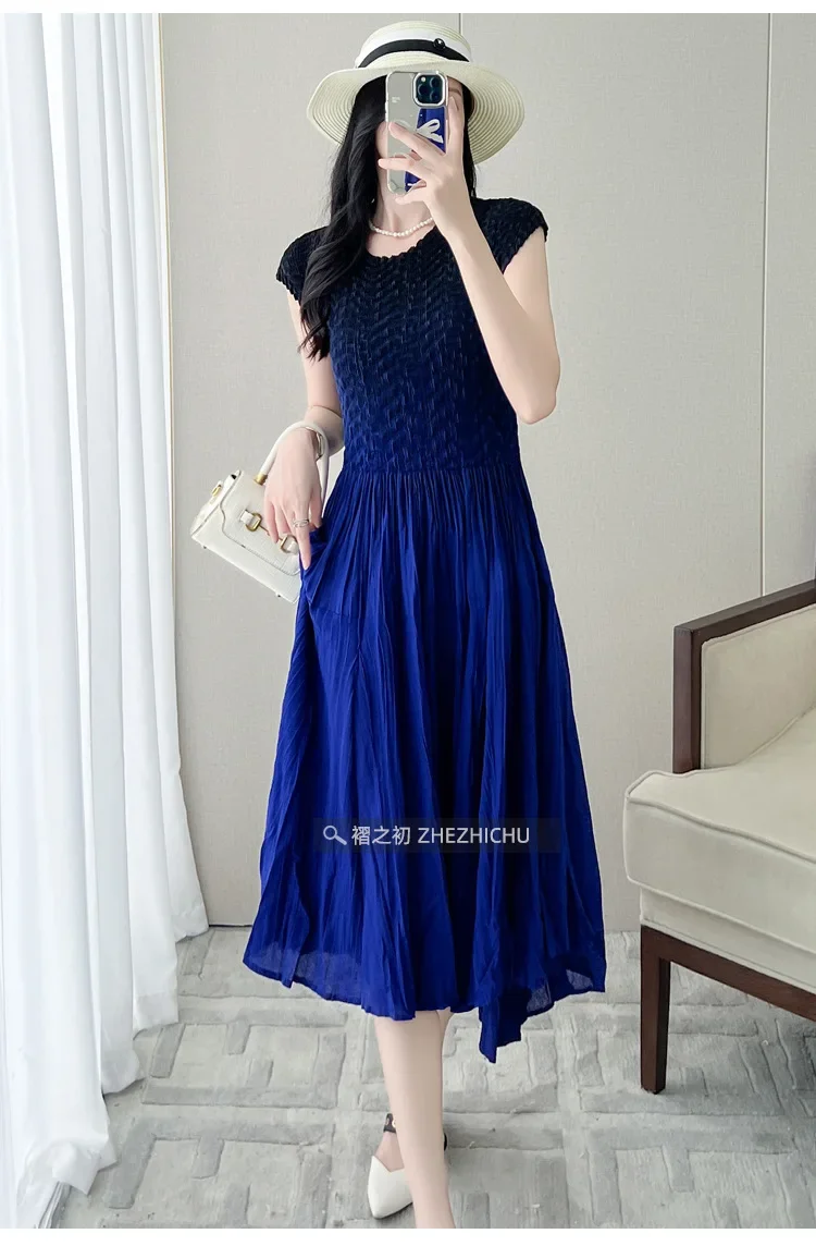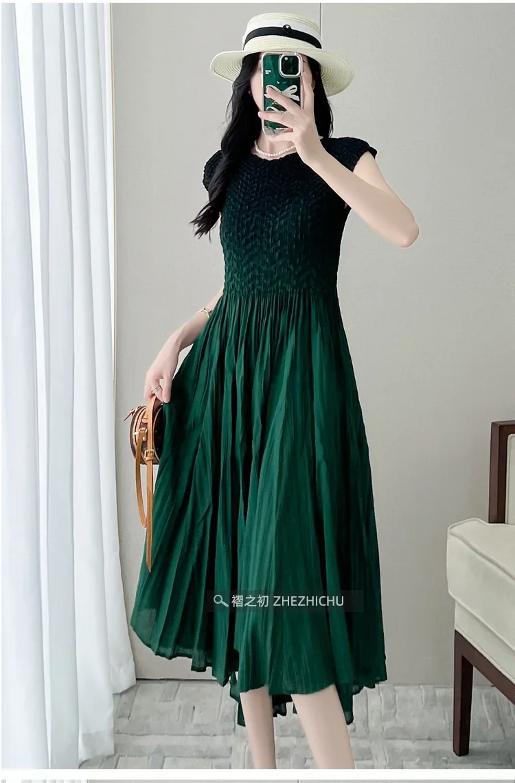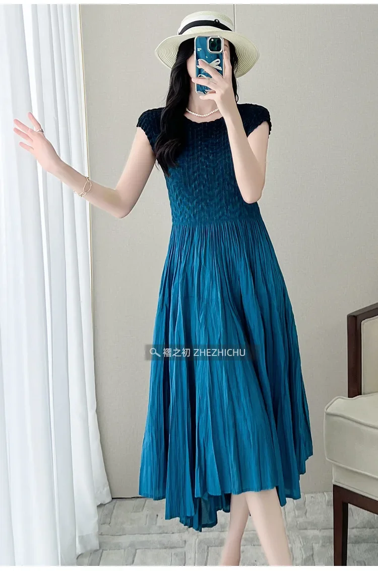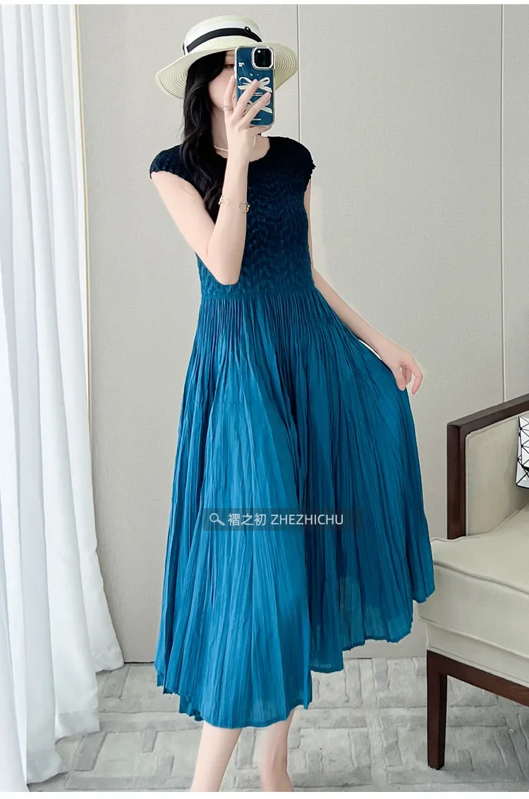 Miyake Abito elegante a pieghe Donna 2025 Nuovo colore sfumato Slim Girocollo senza maniche Temperamento Gonna lunga a pieghe impiombata