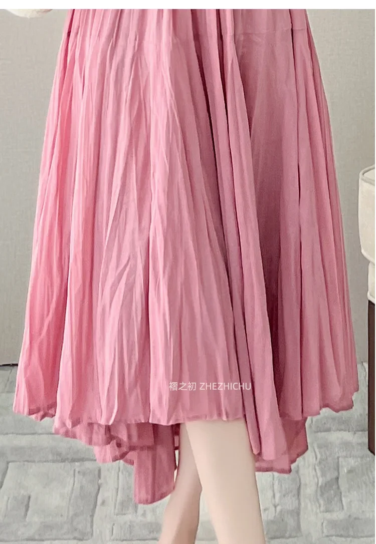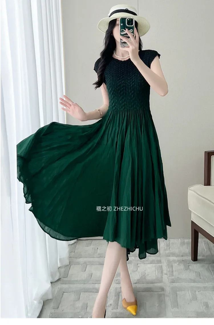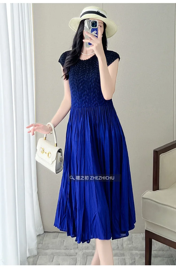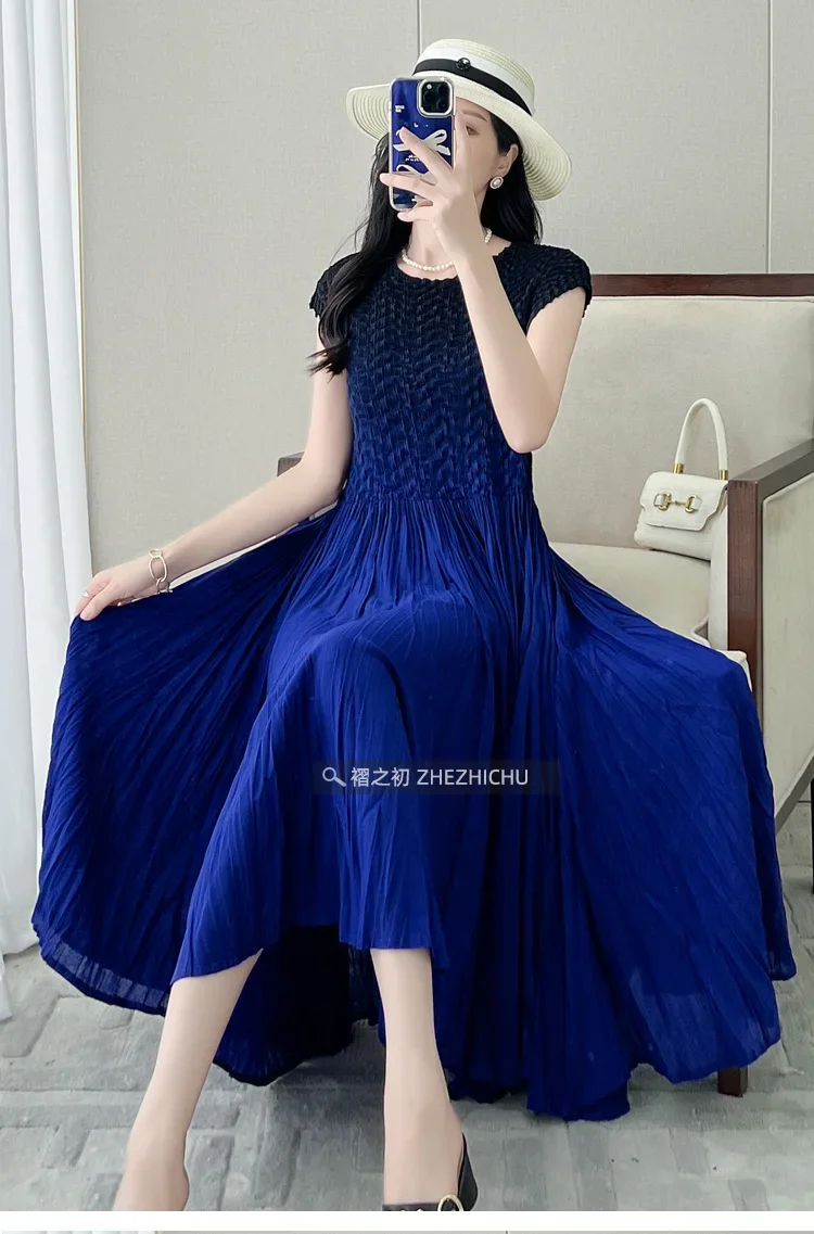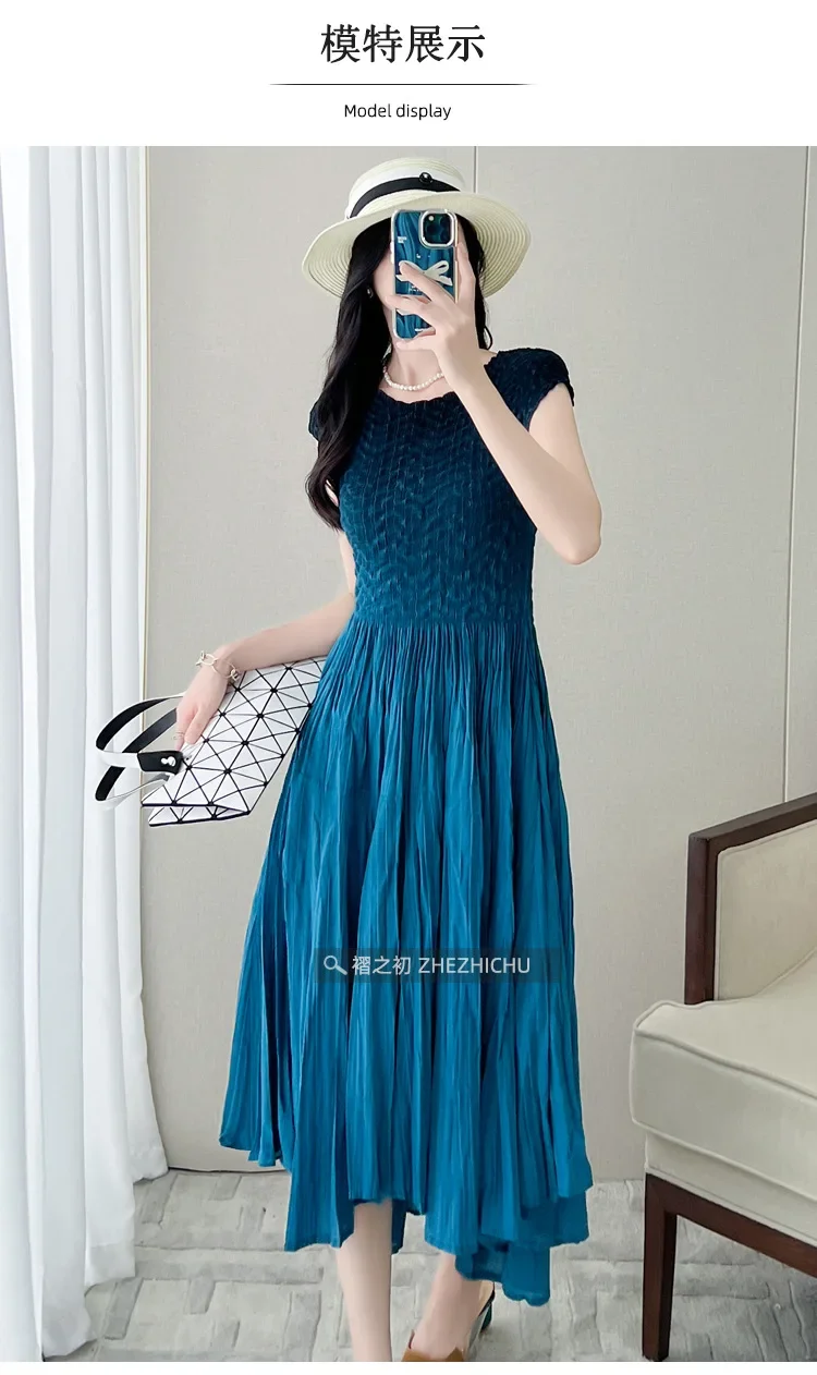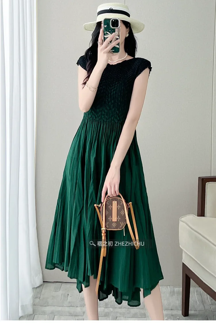 Miyake Abito elegante a pieghe Donna 2025 Nuovo colore sfumato Slim Girocollo senza maniche Temperamento Gonna lunga a pieghe impiombata