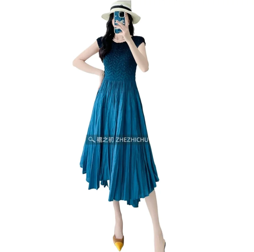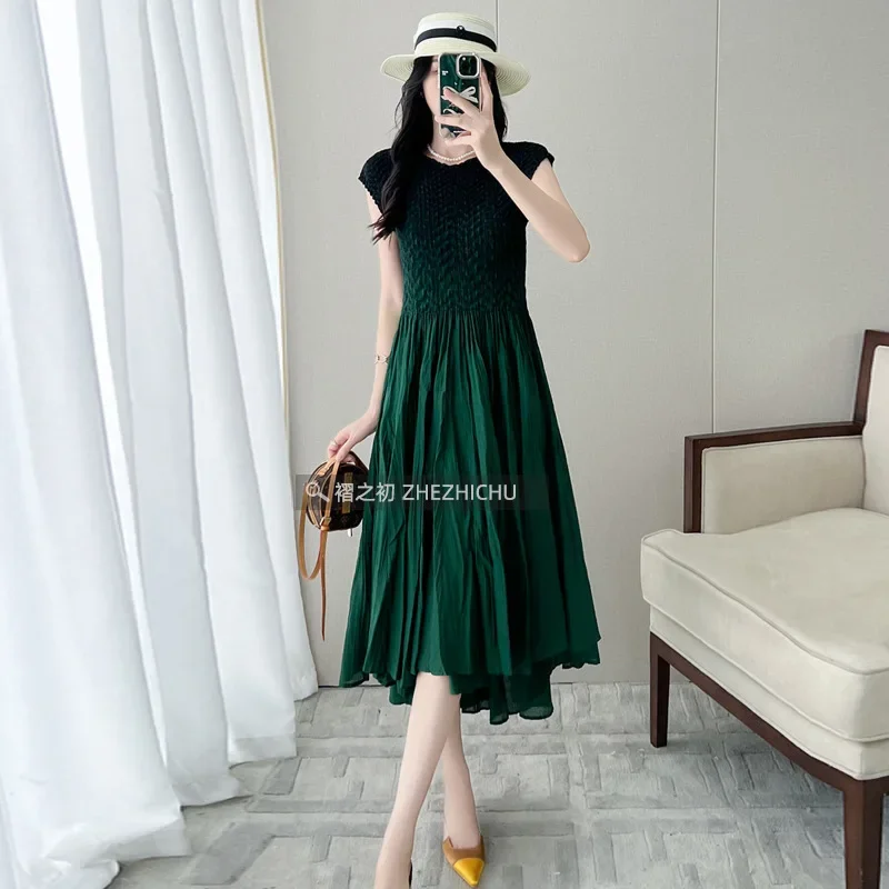 Miyake Abito elegante a pieghe Donna 2025 Nuovo colore sfumato Slim Girocollo senza maniche Temperamento Gonna lunga a pieghe impiombata